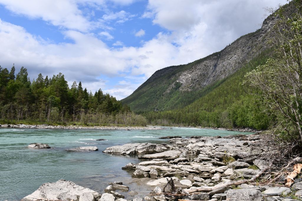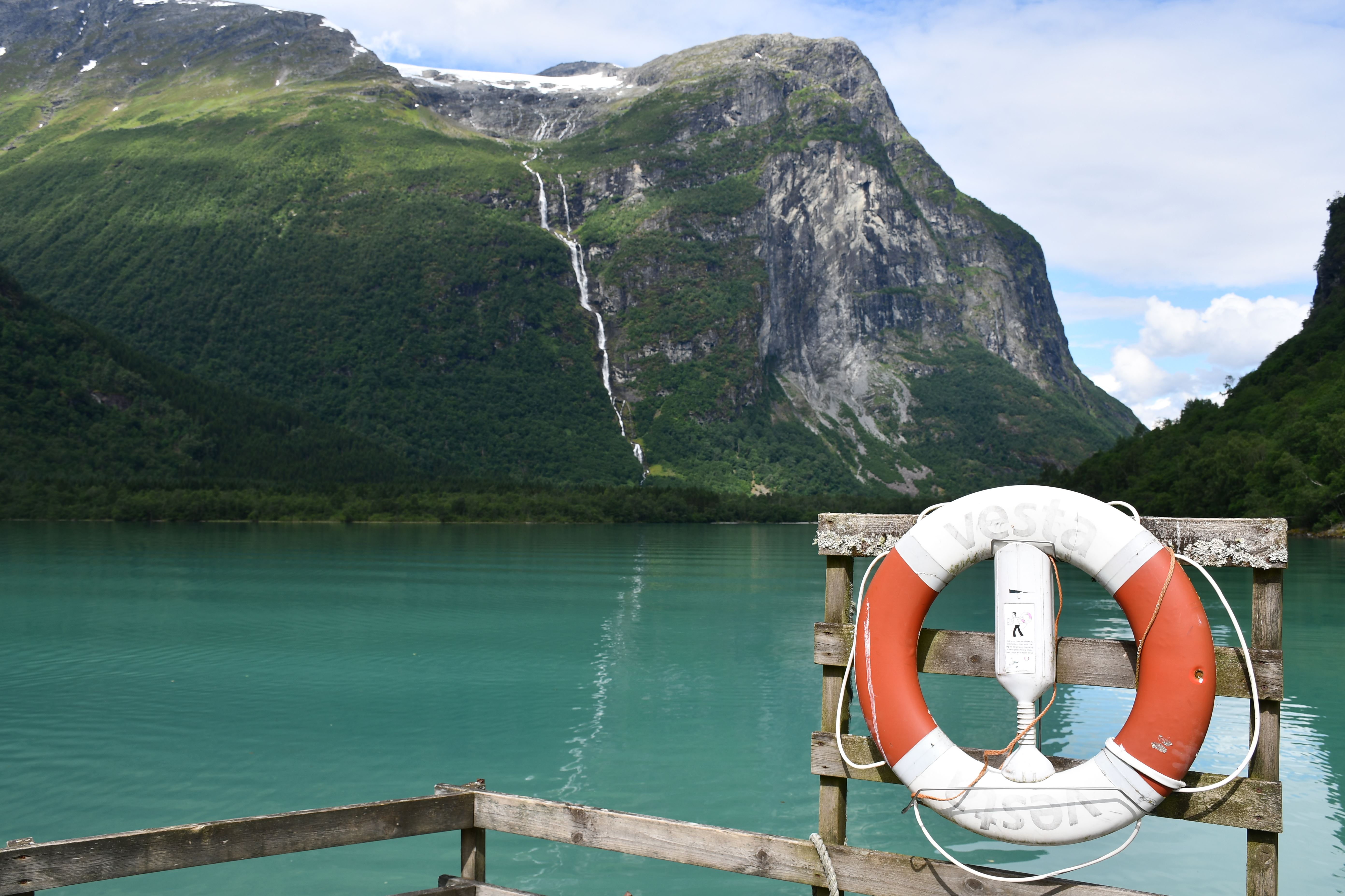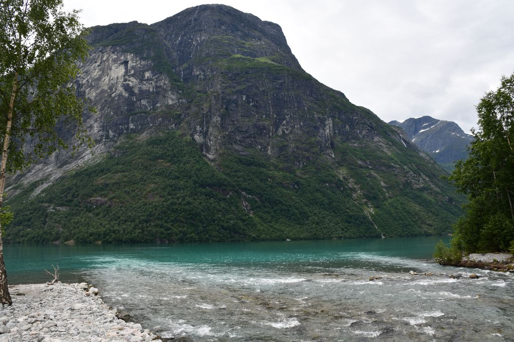 Nachdem ich per Bike-Express den Rückweg bergab in 12 Minuten (Hinfahrt 1h16min) bestreite vollende ich die sportliche Tagesschallenge mit einem Bad im Lovatnet See. Direkt am einmündenden Fluss verspricht das Wasser winterliche Temperaturen. Und es hält sich, geschätzte 6-8 Grad lassen meine sportlichen Aktivitäten wasserseits recht schnell erlahmen weshalb ich am Ende lediglich 5 Meter Strecke aufweisen kann. Immerhin.