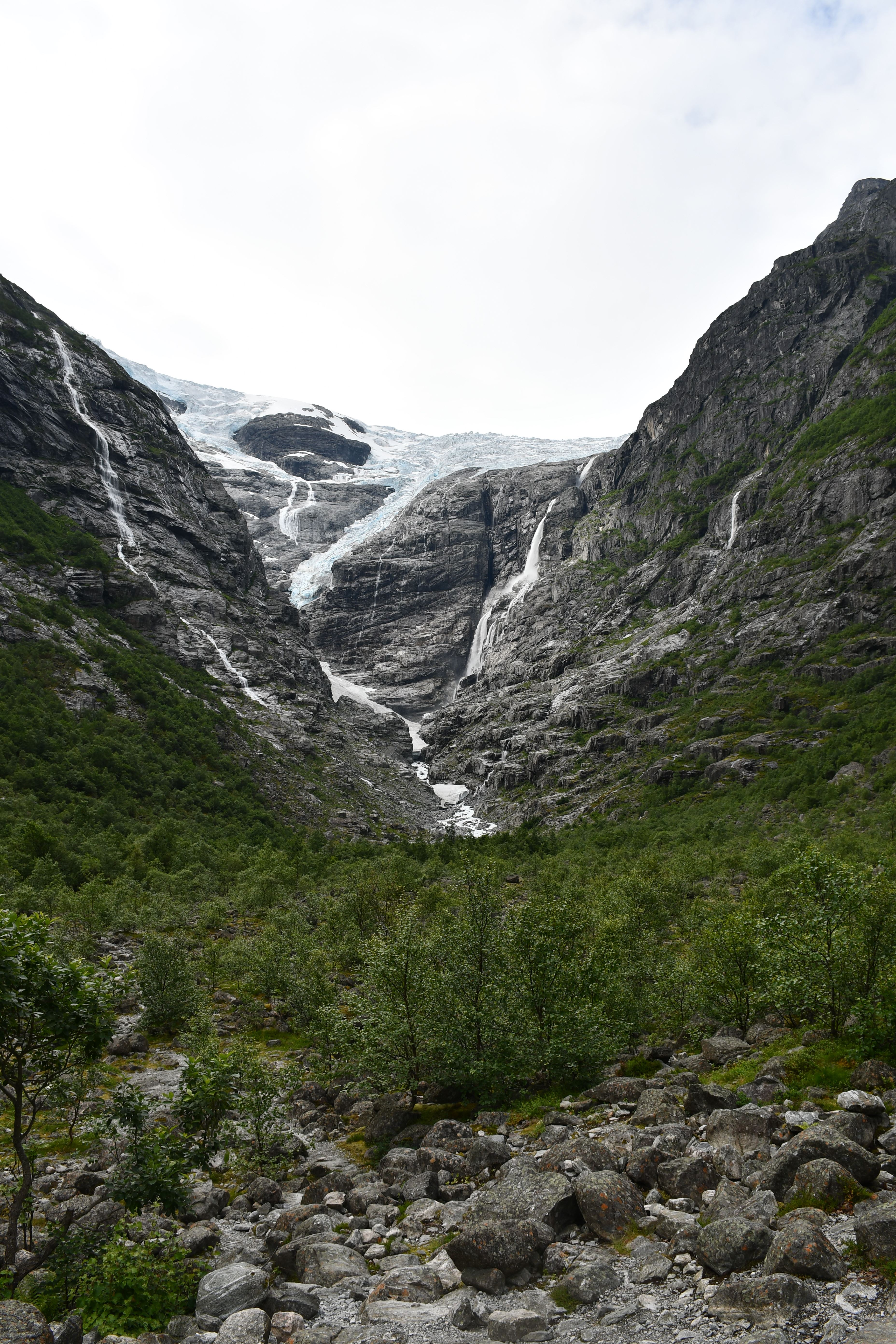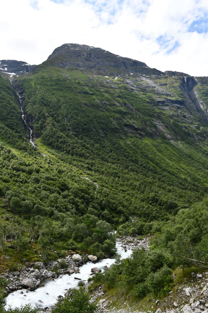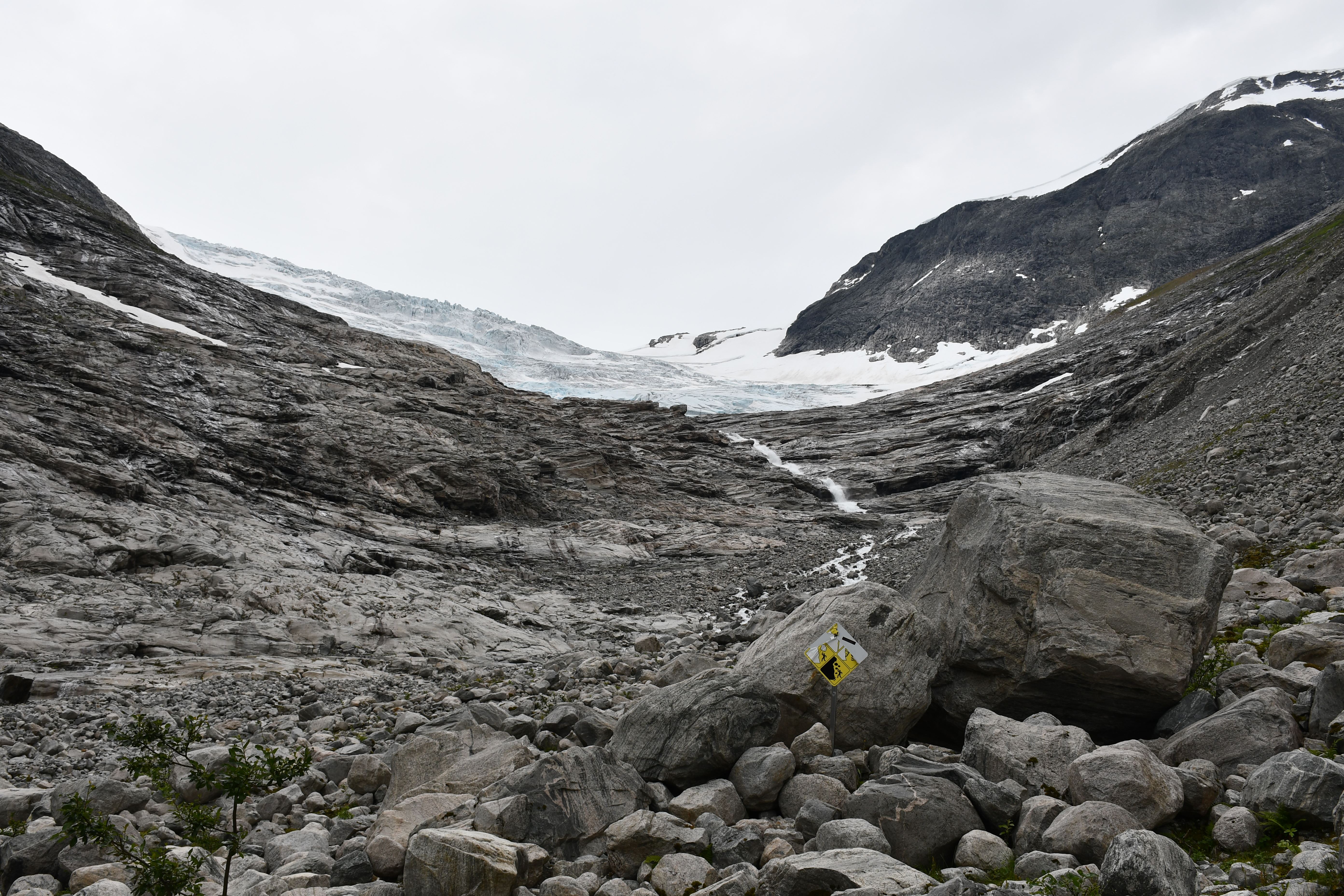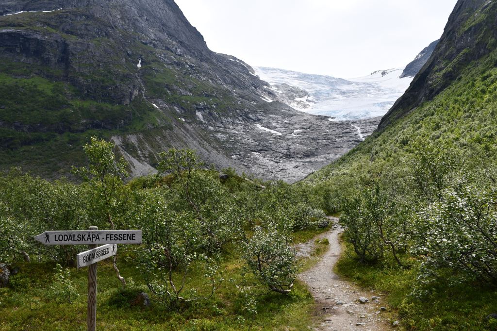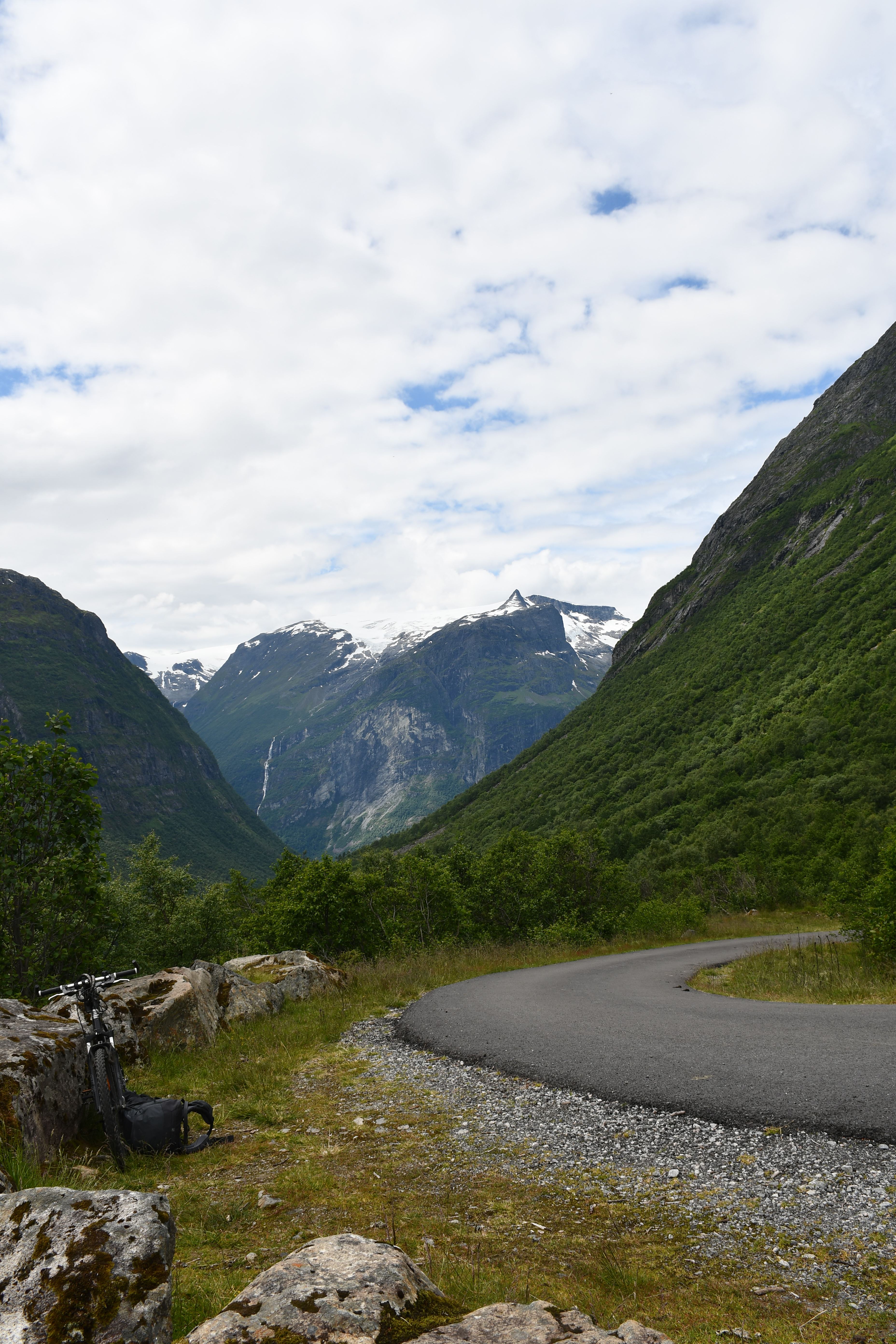 Ansonsten habe ich mir heute einen klassischen Triathlon in den Bereichen Fahrrad fahren, Wandern und Schwimmen gegeben. Angefangen hat alles mit einer kleinen Autofahrt bis ans Ende des Lovatnet Sees wo die Aussicht auf 20€ weniger im Portemonnaie zur Benutzung der folgenden Straße wenig Zustimmung bei mir findet. Also parke ich etwas weiter vorne und schnappe mir mein Bike. Erstes Ziel ist der größte hiesige Gletscher der dankenswerterweise an dieser Stelle per Fahrrad zu erreichen ist (damit auch per Auto oder Bus, was irgendwie lächerlich ist). Lediglich die letzten 200 Meter muss man per Fuß zurücklegen.