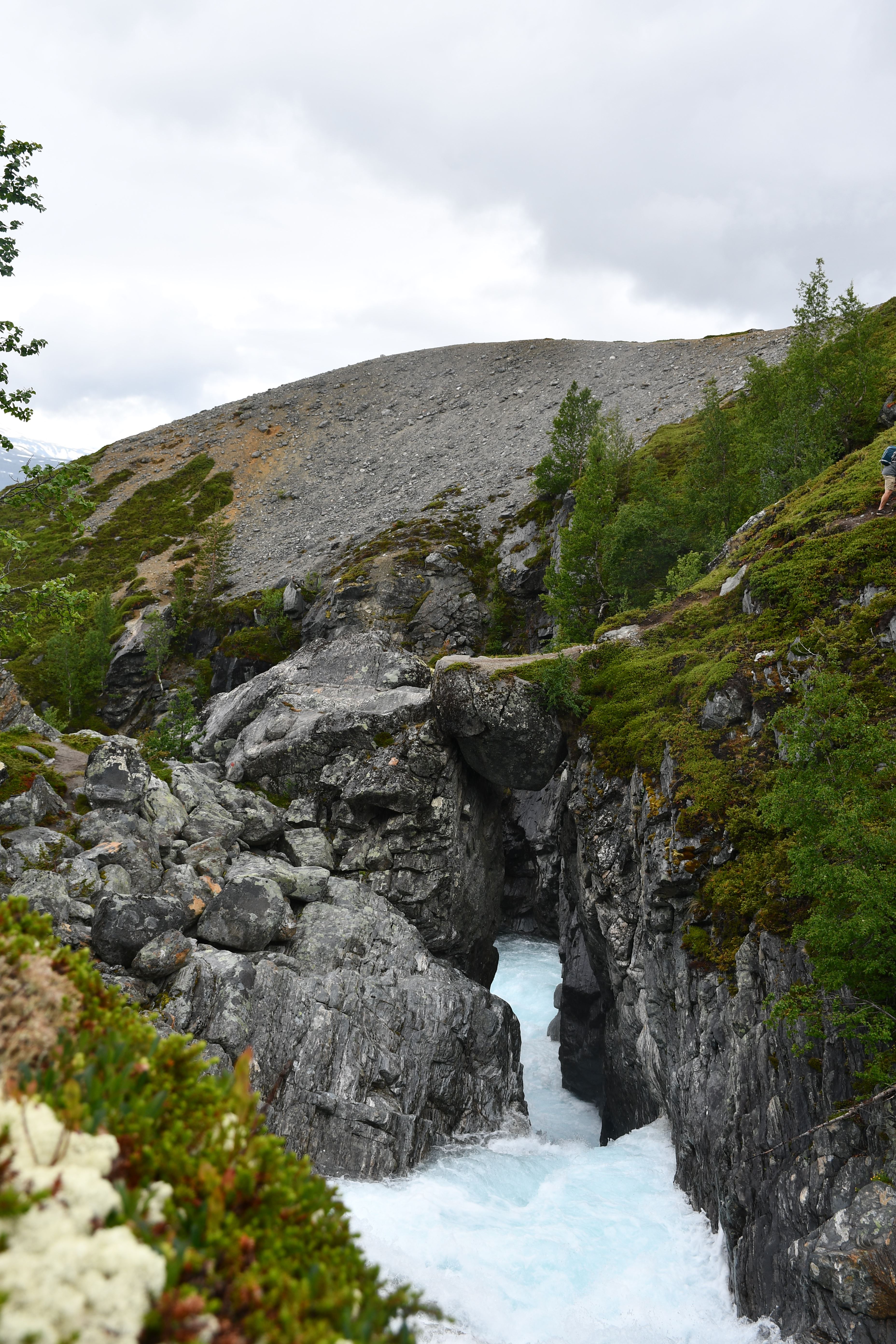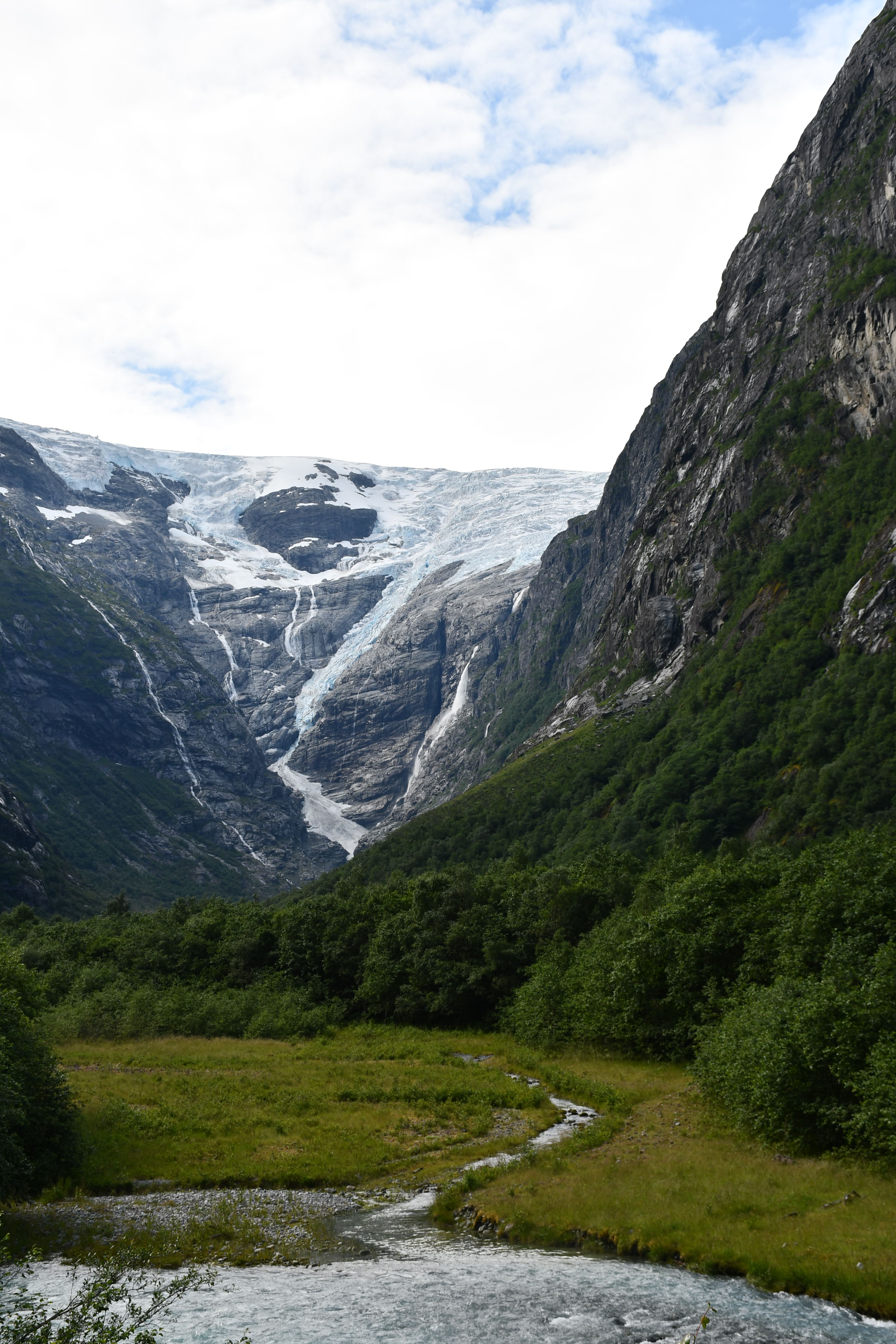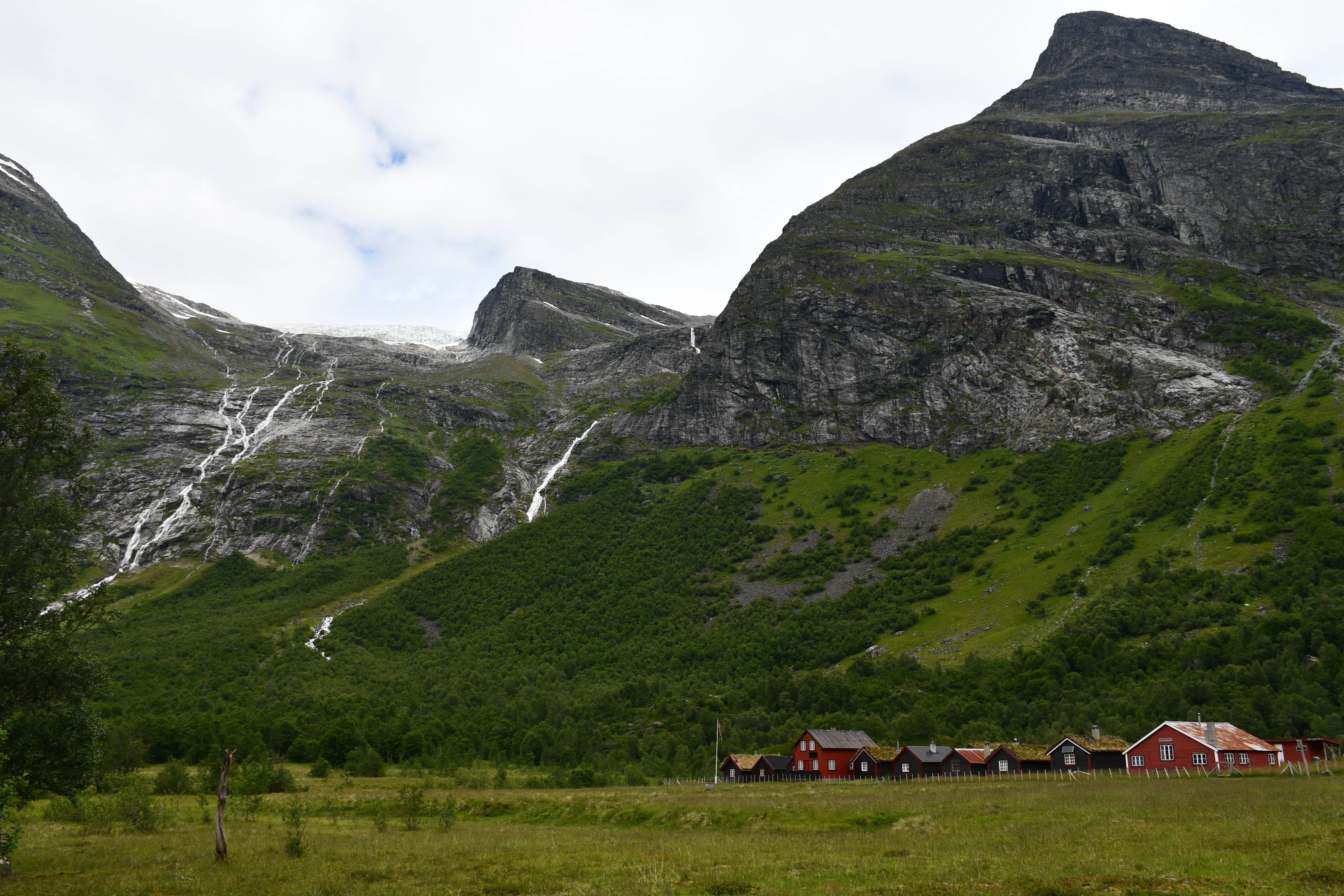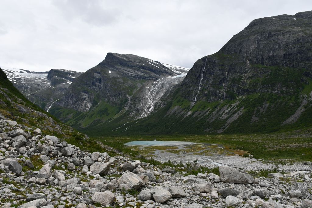 Ansonsten habe ich mir heute einen klassischen Triathlon in den Bereichen Fahrrad fahren, Wandern und Schwimmen gegeben. Angefangen hat alles mit einer kleinen Autofahrt bis ans Ende des Lovatnet Sees wo die Aussicht auf 20€ weniger im Portemonnaie zur Benutzung der folgenden Straße wenig Zustimmung bei mir findet. Also parke ich etwas weiter vorne und schnappe mir mein Bike. Erstes Ziel ist der größte hiesige Gletscher der dankenswerterweise an dieser Stelle per Fahrrad zu erreichen ist (damit auch per Auto oder Bus, was irgendwie lächerlich ist). Lediglich die letzten 200 Meter muss man per Fuß zurücklegen.