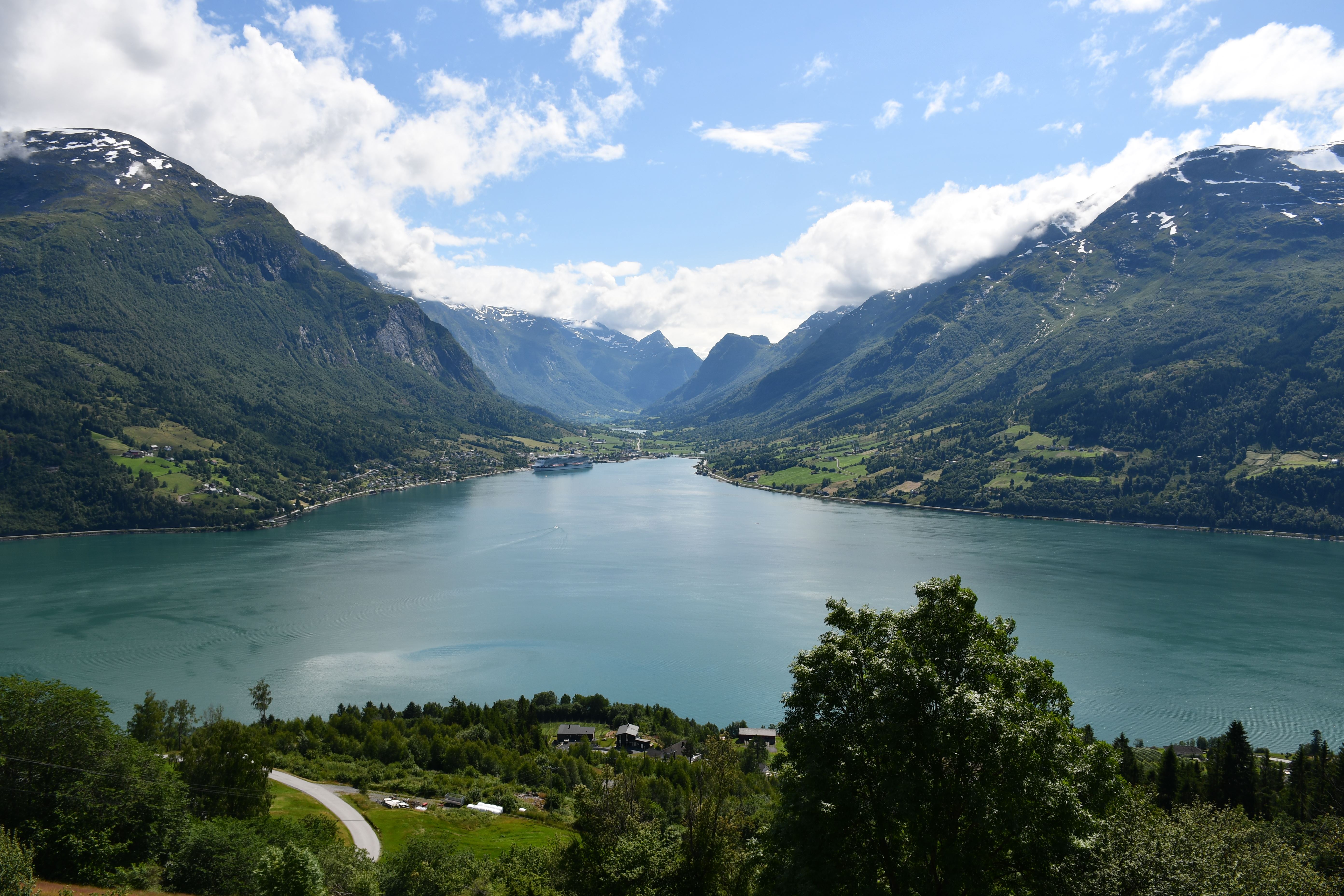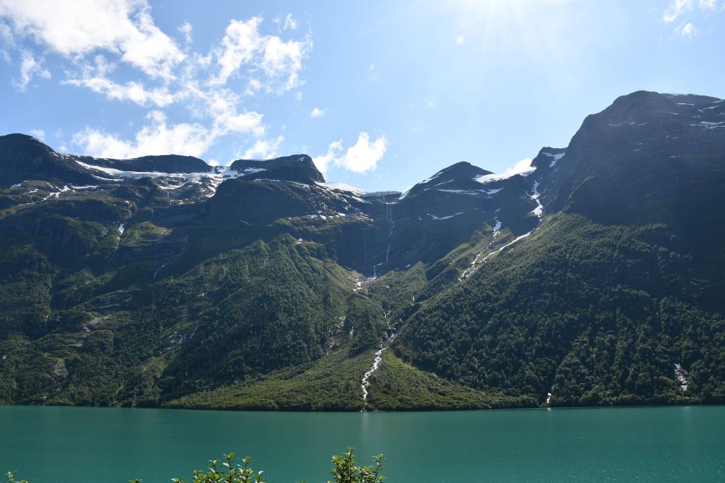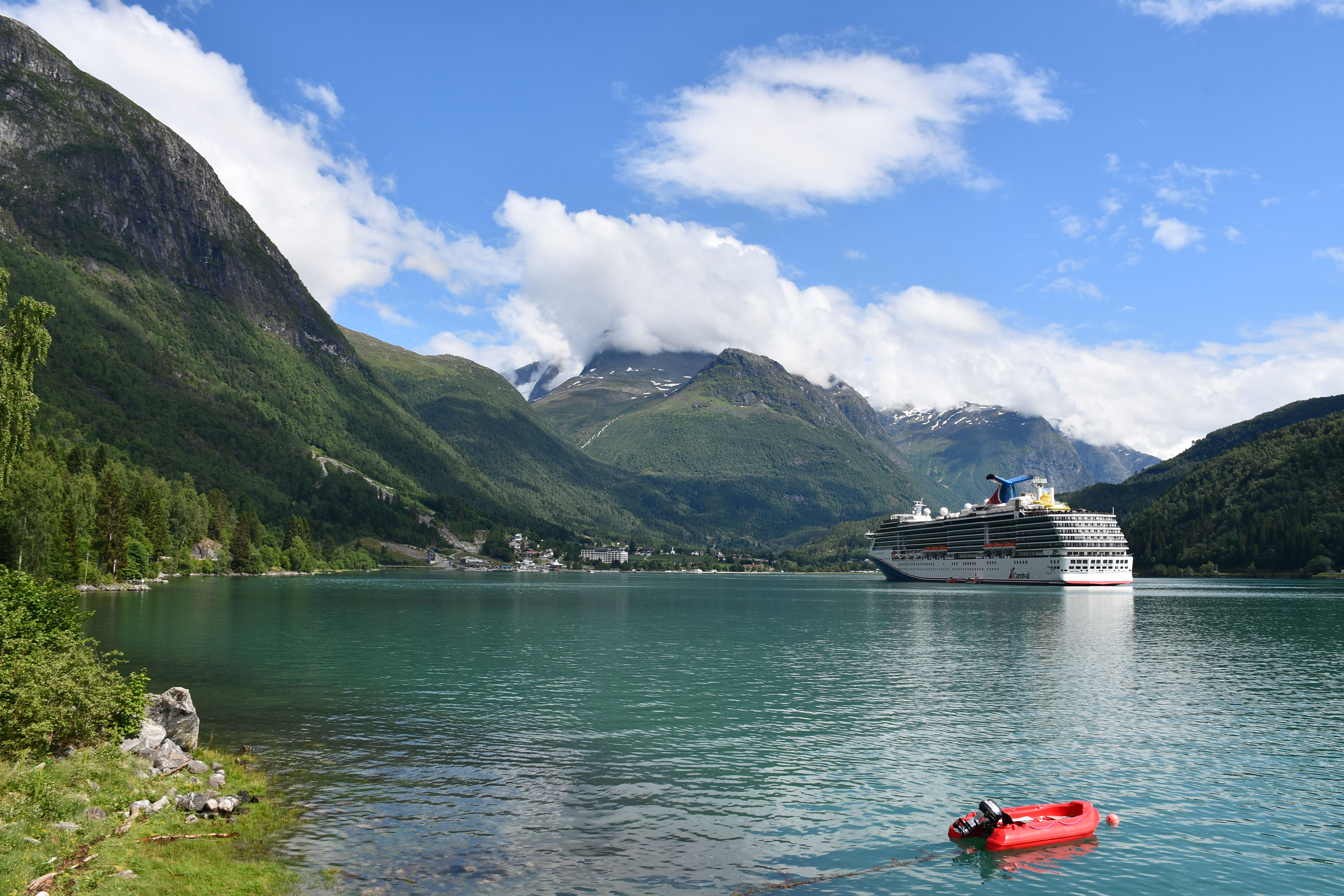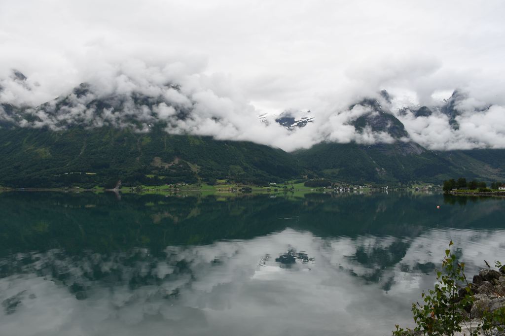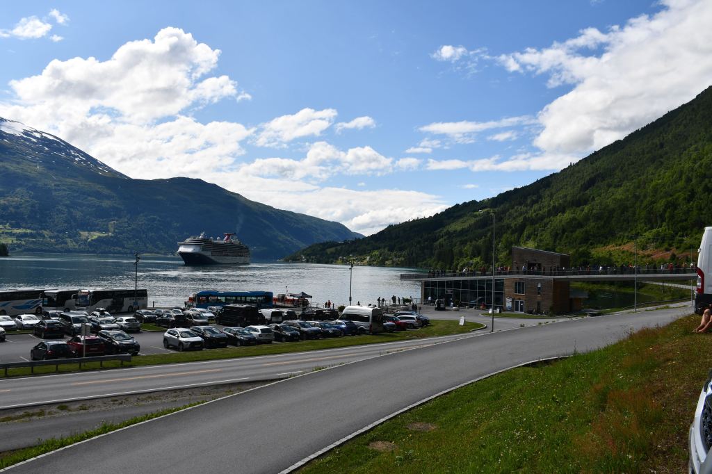 Auf zum ersten Fjord meines Lebens. Der Innvikfjorden. Der schlängelt sich schätzungsweise zwischen 100 und 200 Kilometer ins Landesinnere und bietet damit Kreuzfahrtschiffen die Möglichkeit weit ins Landesinnere vorzustoßen. Für mein Verständnis eine unnötige Umweltverschmutzung sondergleichen, aber das muss jeder für sich selbst wissen. Meins wäre es in keinem Fall. In Loen wo die steilste Seilbahn der Welt ihren Standort hat wird mir dies einmal mehr bewusst. Hier werden die Schiffsreisenden zu hunderten in Beibooten an Land gekarrt um sich dort dann für schlappe 55€ auf den Berg gondeln zu lassen. Foto machen, wieder runter und weiter geht die Bootstour. Ganz toll. Naja, rein optisch passen diese riesigen Kähne auch eher weniger in die Landschaft. Davon abgesehen hat der Fjord in diesem Bereich locker 4 Sterne verdient.