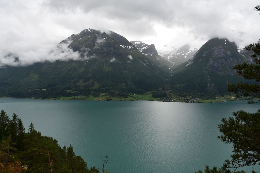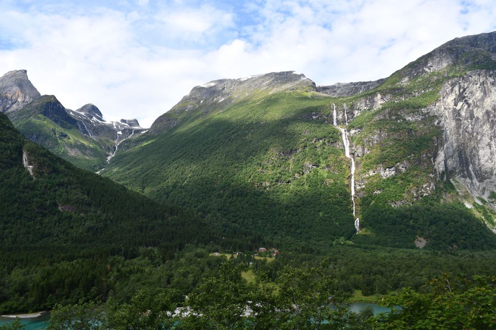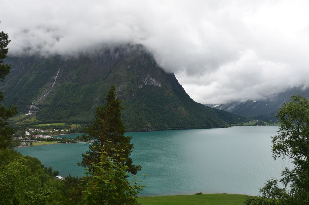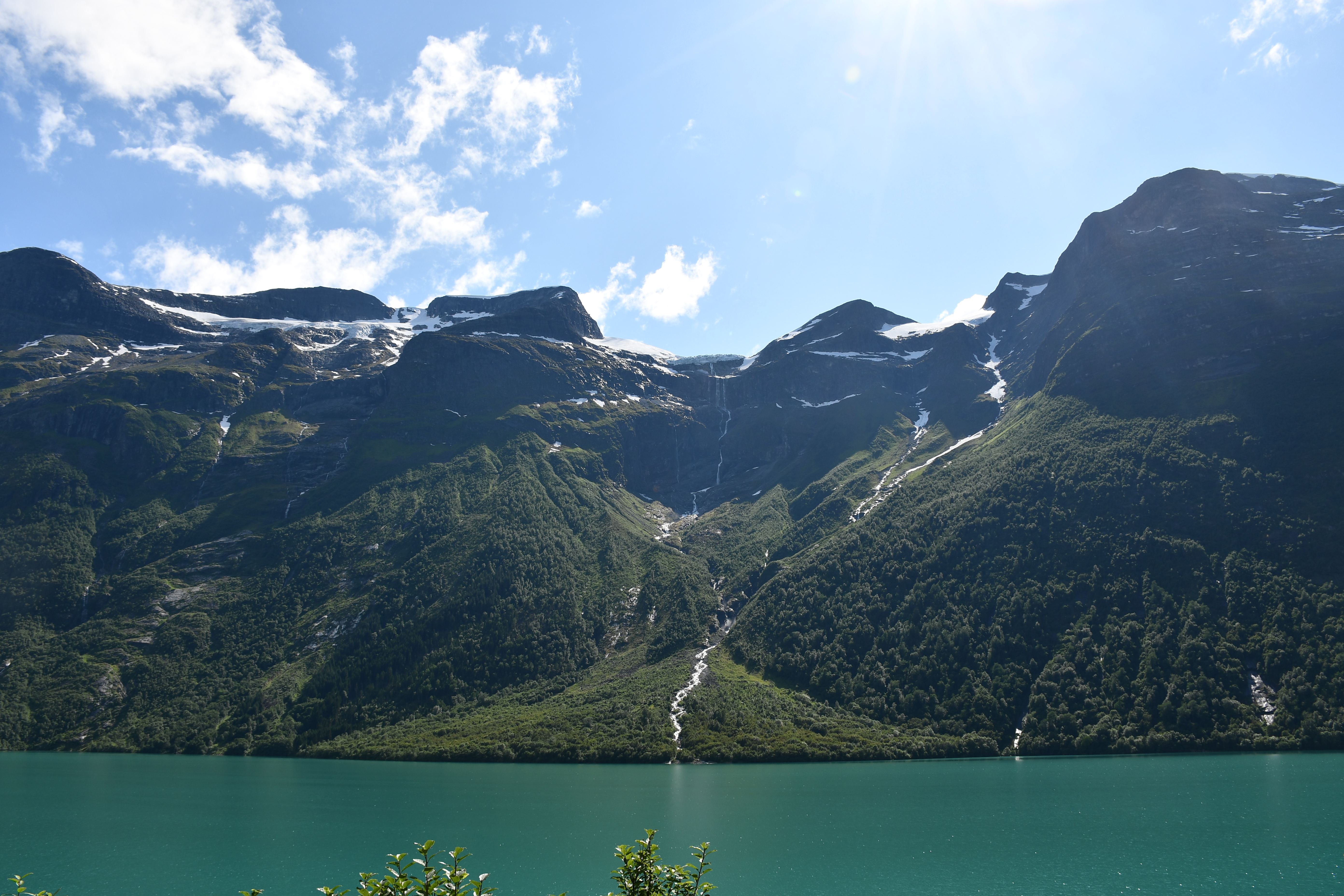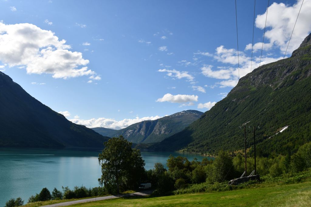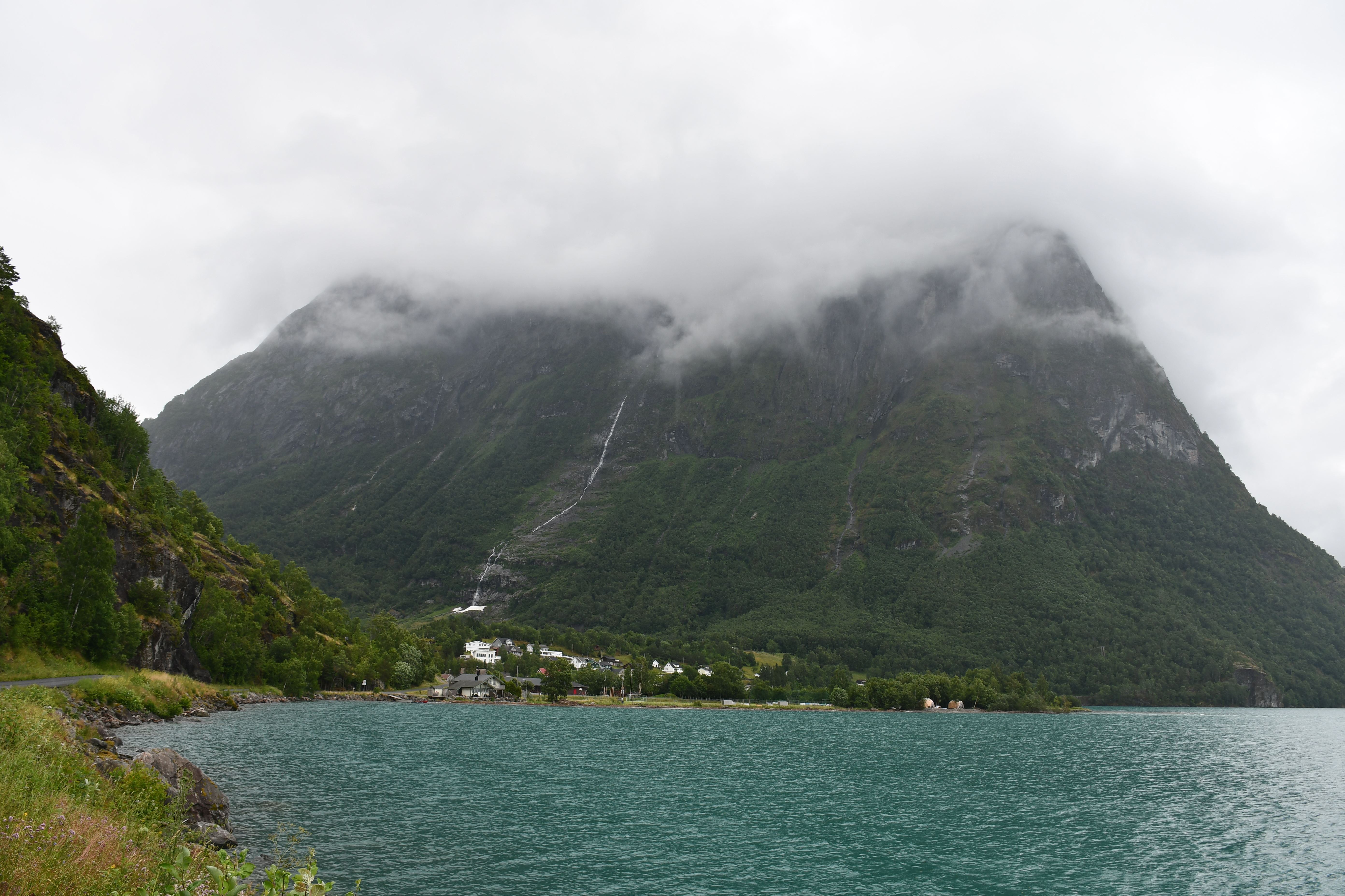 Auf zum ersten Fjord meines Lebens. Der Innvikfjorden. Der schlängelt sich schätzungsweise zwischen 100 und 200 Kilometer ins Landesinnere und bietet damit Kreuzfahrtschiffen die Möglichkeit weit ins Landesinnere vorzustoßen. Für mein Verständnis eine unnötige Umweltverschmutzung sondergleichen, aber das muss jeder für sich selbst wissen. Meins wäre es in keinem Fall. In Loen wo die steilste Seilbahn der Welt ihren Standort hat wird mir dies einmal mehr bewusst. Hier werden die Schiffsreisenden zu hunderten in Beibooten an Land gekarrt um sich dort dann für schlappe 55€ auf den Berg gondeln zu lassen. Foto machen, wieder runter und weiter geht die Bootstour. Ganz toll. Naja, rein optisch passen diese riesigen Kähne auch eher weniger in die Landschaft. Davon abgesehen hat der Fjord in diesem Bereich locker 4 Sterne verdient.