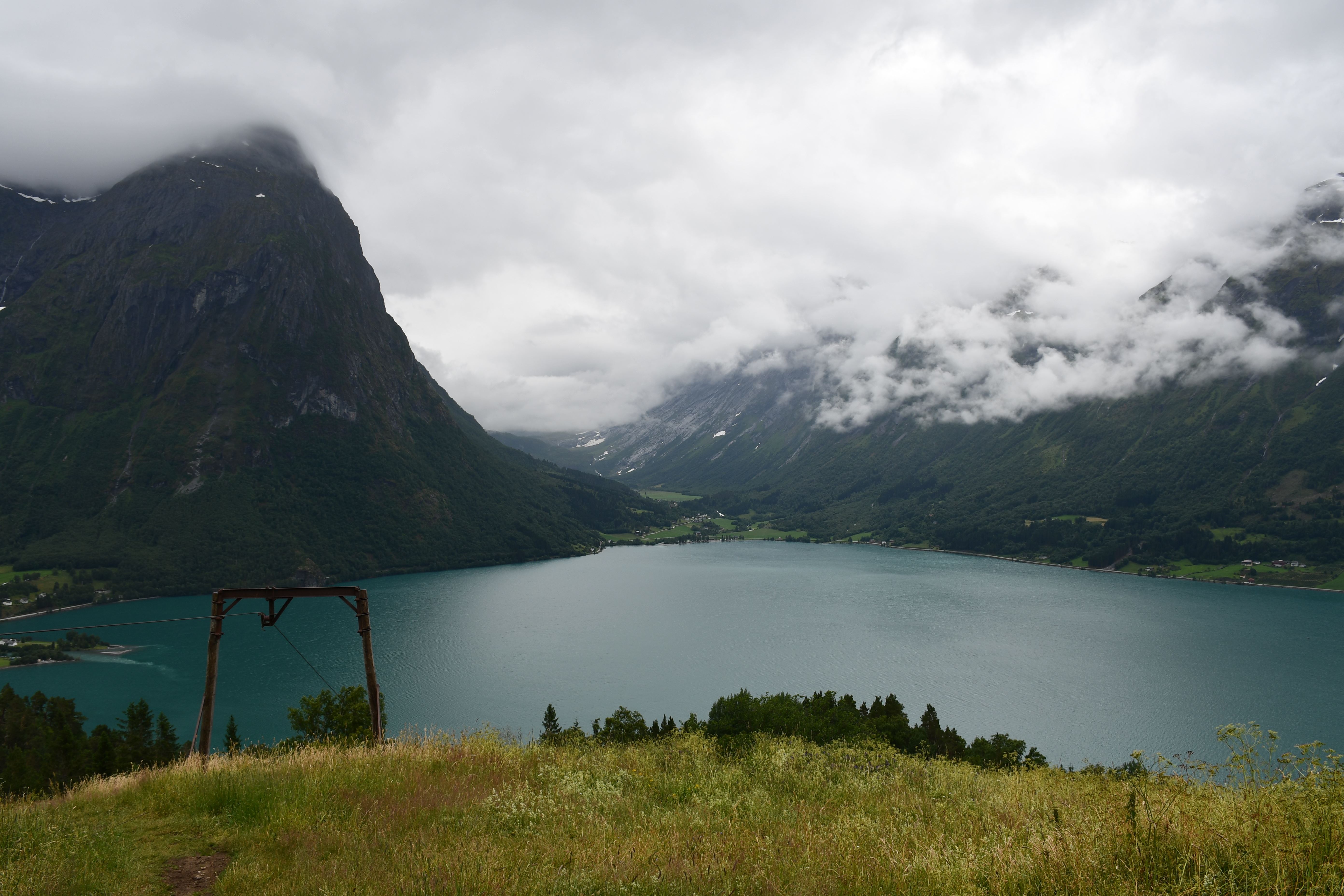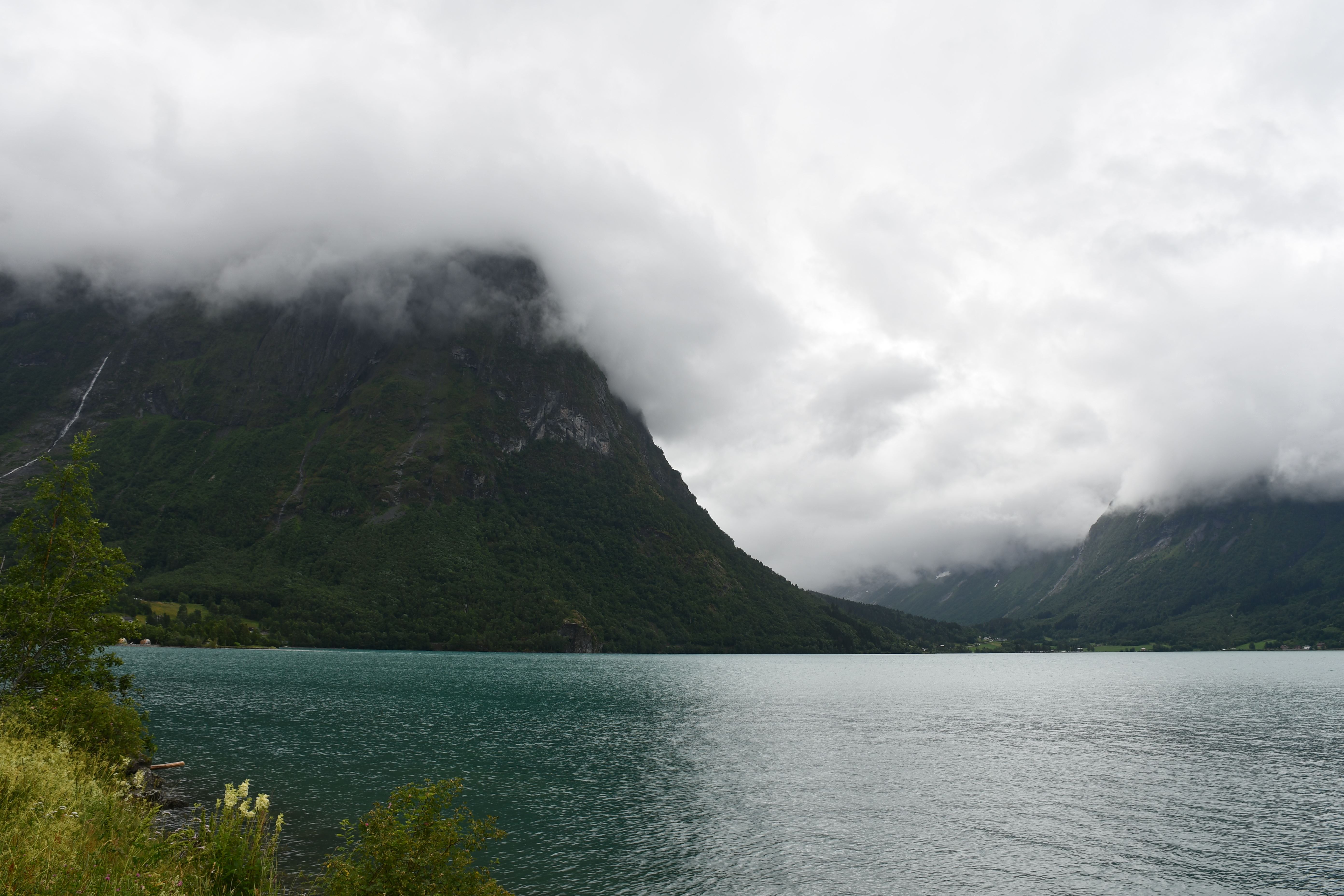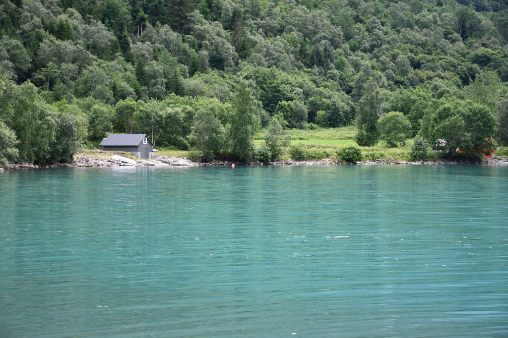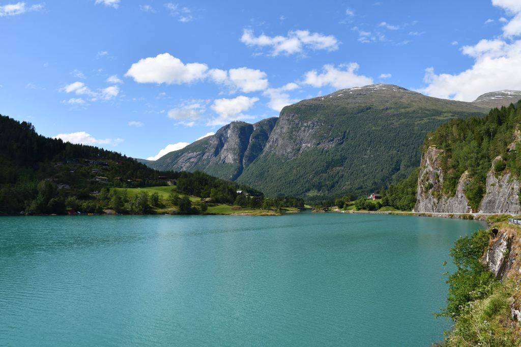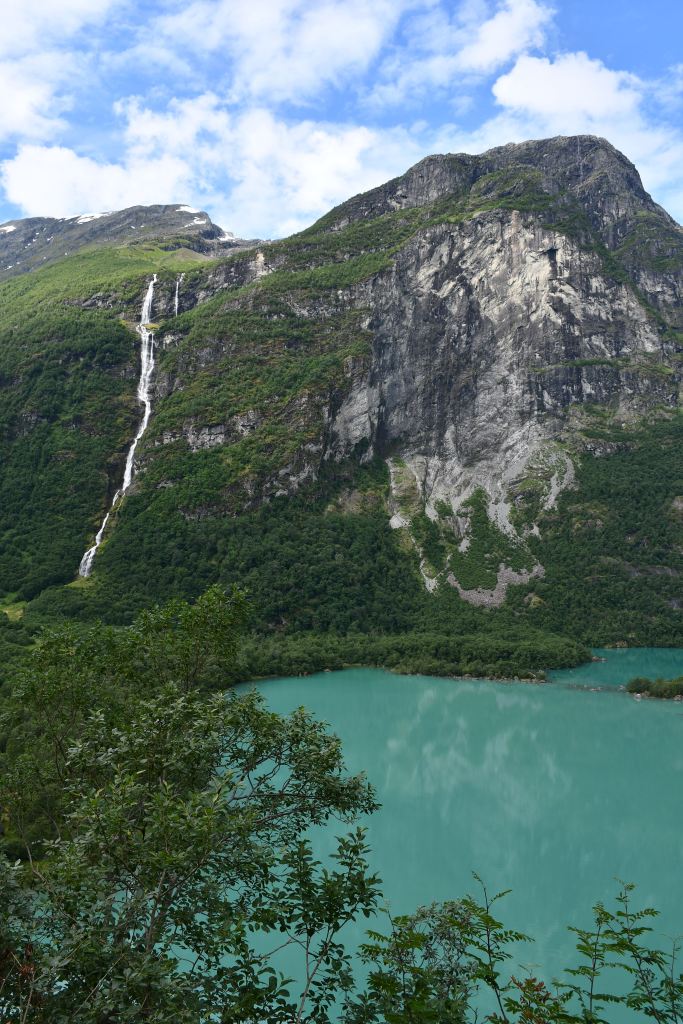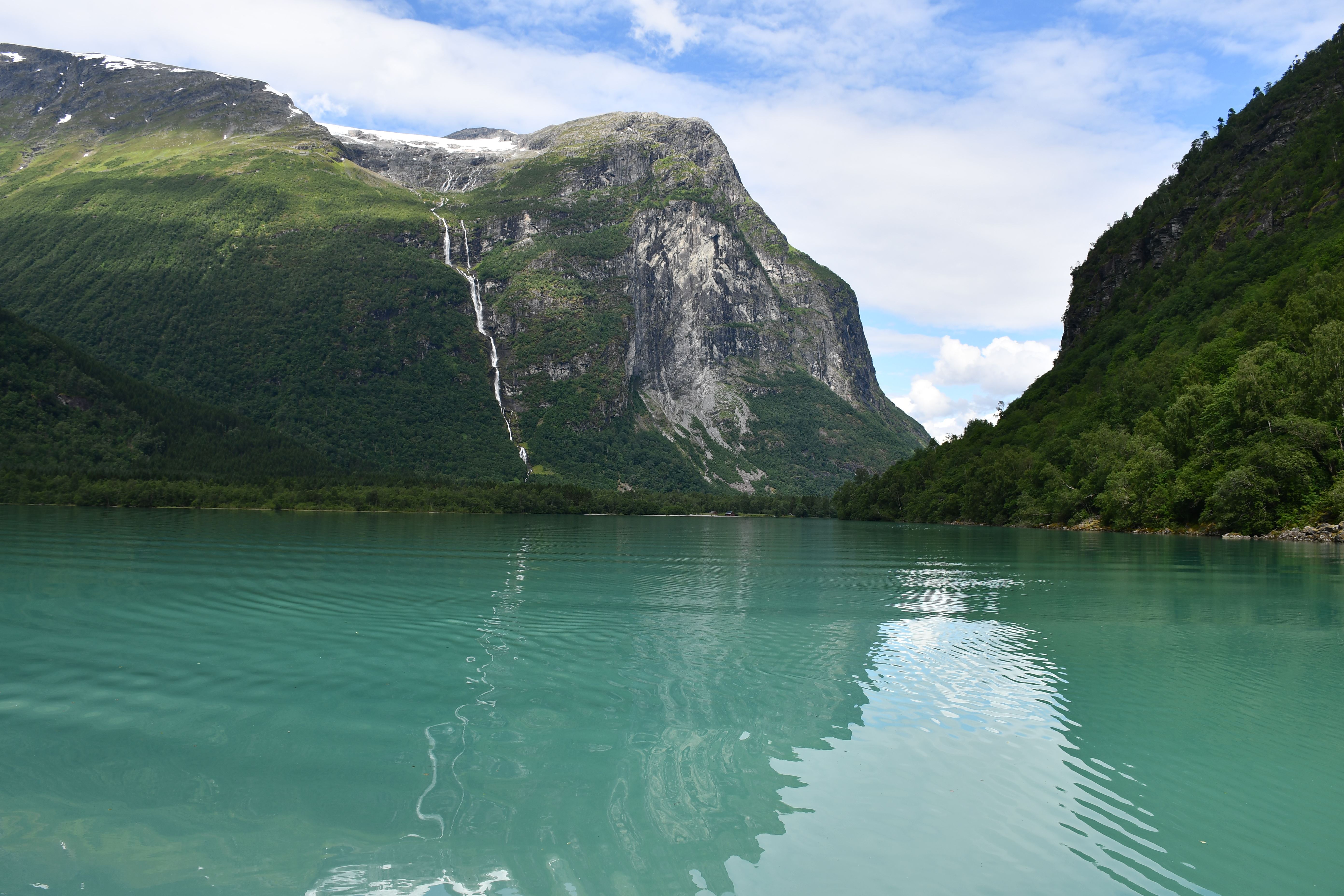 Auf zum ersten Fjord meines Lebens. Der Innvikfjorden. Der schlängelt sich schätzungsweise zwischen 100 und 200 Kilometer ins Landesinnere und bietet damit Kreuzfahrtschiffen die Möglichkeit weit ins Landesinnere vorzustoßen. Für mein Verständnis eine unnötige Umweltverschmutzung sondergleichen, aber das muss jeder für sich selbst wissen. Meins wäre es in keinem Fall. In Loen wo die steilste Seilbahn der Welt ihren Standort hat wird mir dies einmal mehr bewusst. Hier werden die Schiffsreisenden zu hunderten in Beibooten an Land gekarrt um sich dort dann für schlappe 55€ auf den Berg gondeln zu lassen. Foto machen, wieder runter und weiter geht die Bootstour. Ganz toll. Naja, rein optisch passen diese riesigen Kähne auch eher weniger in die Landschaft. Davon abgesehen hat der Fjord in diesem Bereich locker 4 Sterne verdient.