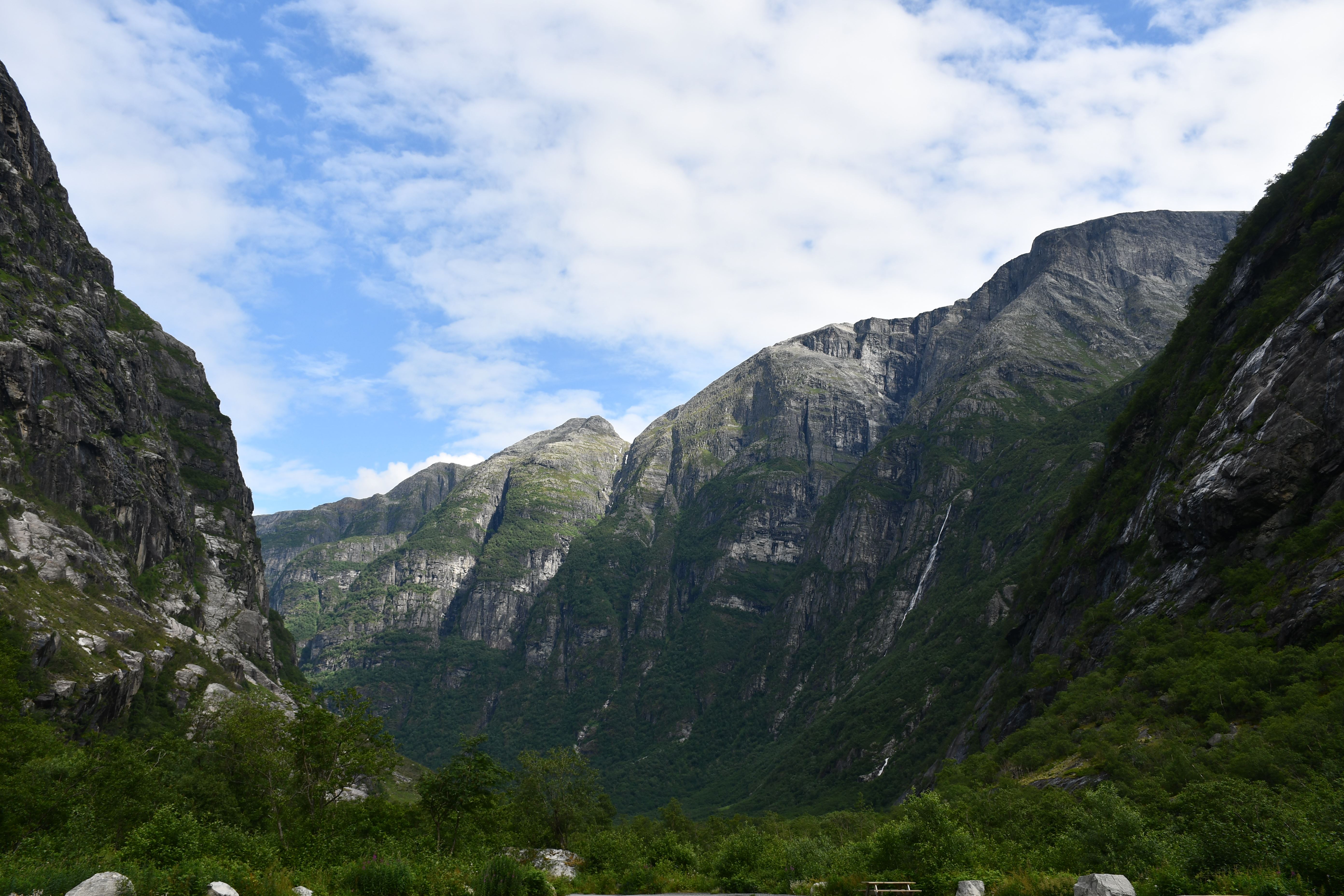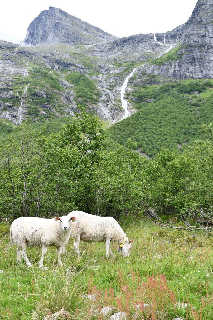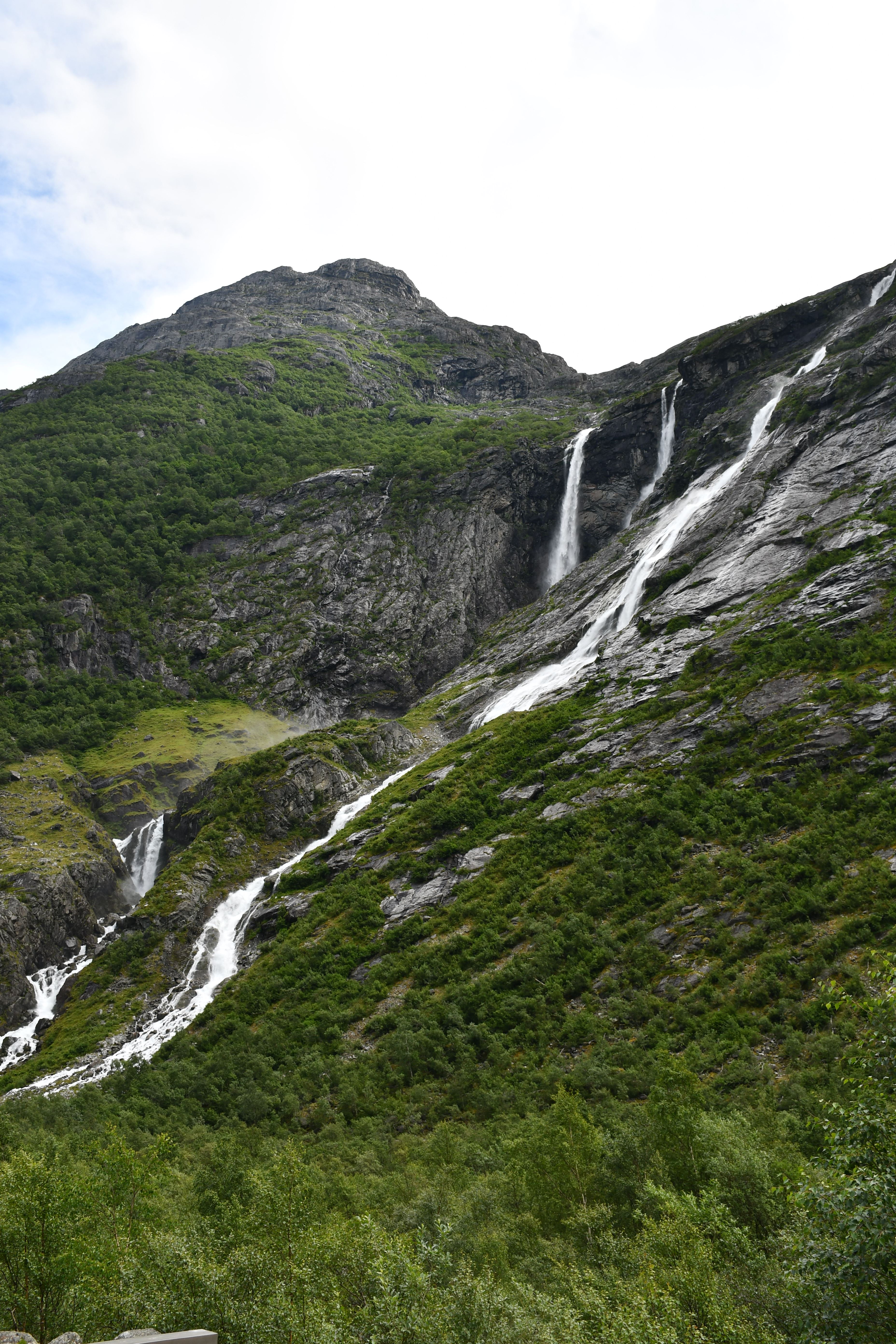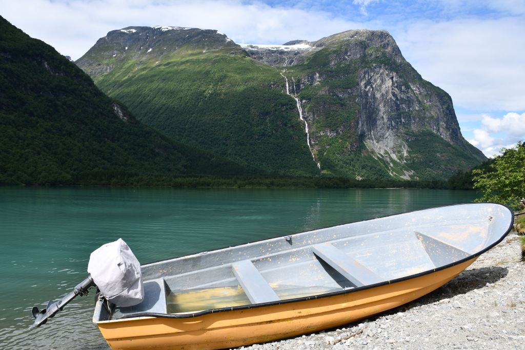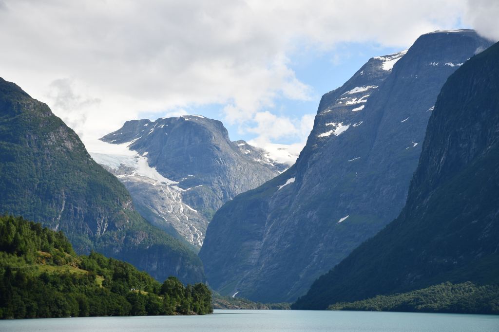 Auf zum ersten Fjord meines Lebens. Der Innvikfjorden. Der schlängelt sich schätzungsweise zwischen 100 und 200 Kilometer ins Landesinnere und bietet damit Kreuzfahrtschiffen die Möglichkeit weit ins Landesinnere vorzustoßen. Für mein Verständnis eine unnötige Umweltverschmutzung sondergleichen, aber das muss jeder für sich selbst wissen. Meins wäre es in keinem Fall. In Loen wo die steilste Seilbahn der Welt ihren Standort hat wird mir dies einmal mehr bewusst. Hier werden die Schiffsreisenden zu hunderten in Beibooten an Land gekarrt um sich dort dann für schlappe 55€ auf den Berg gondeln zu lassen. Foto machen, wieder runter und weiter geht die Bootstour. Ganz toll. Naja, rein optisch passen diese riesigen Kähne auch eher weniger in die Landschaft. Davon abgesehen hat der Fjord in diesem Bereich locker 4 Sterne verdient.