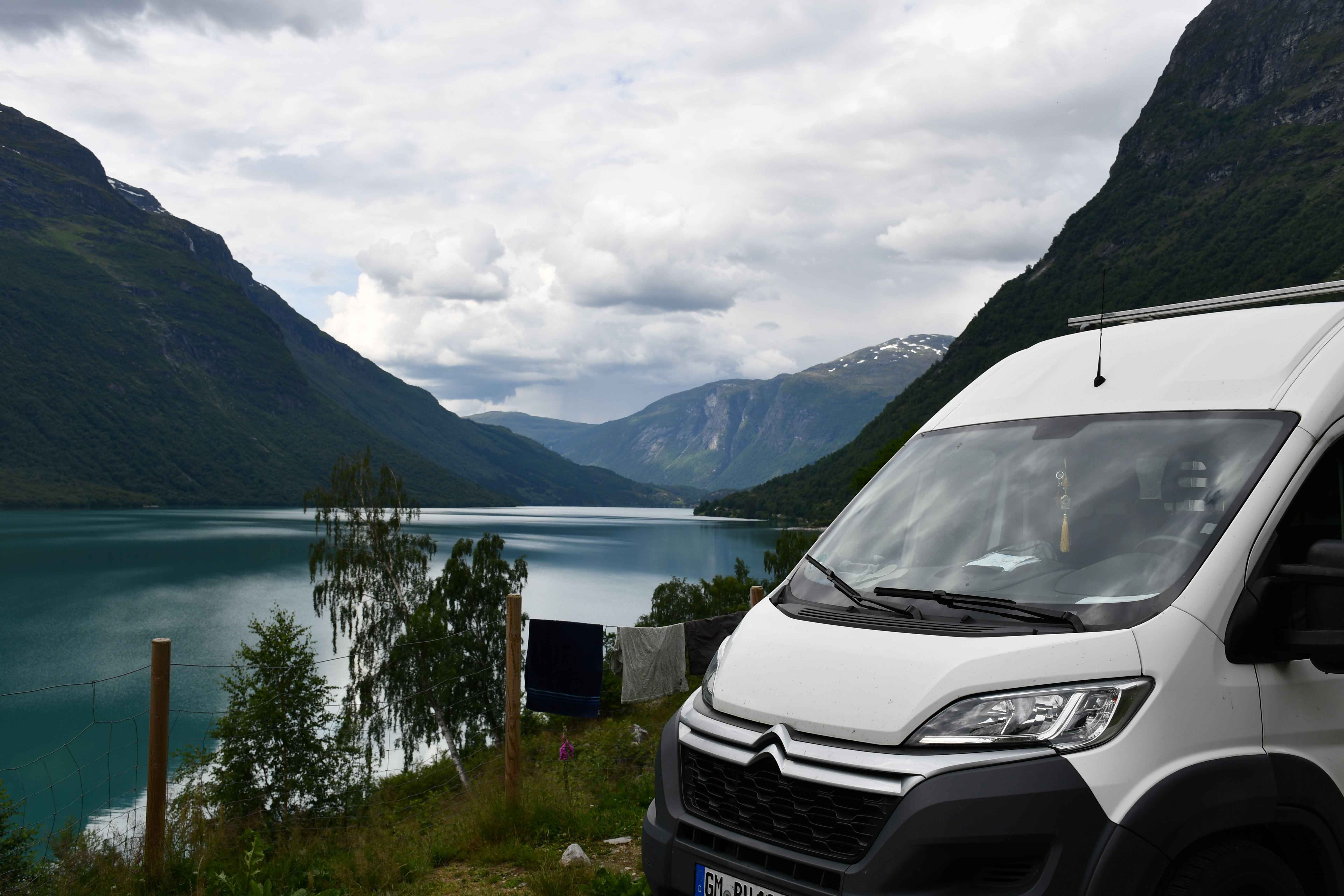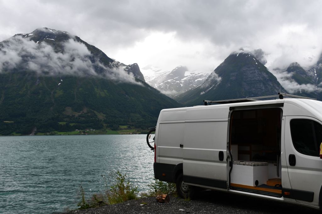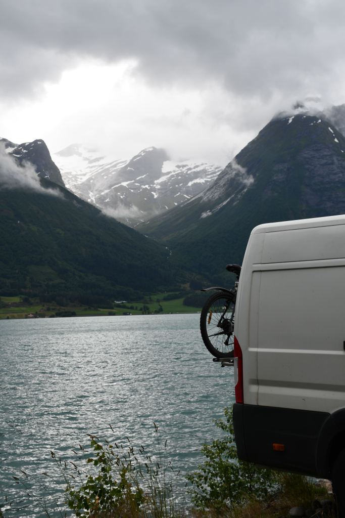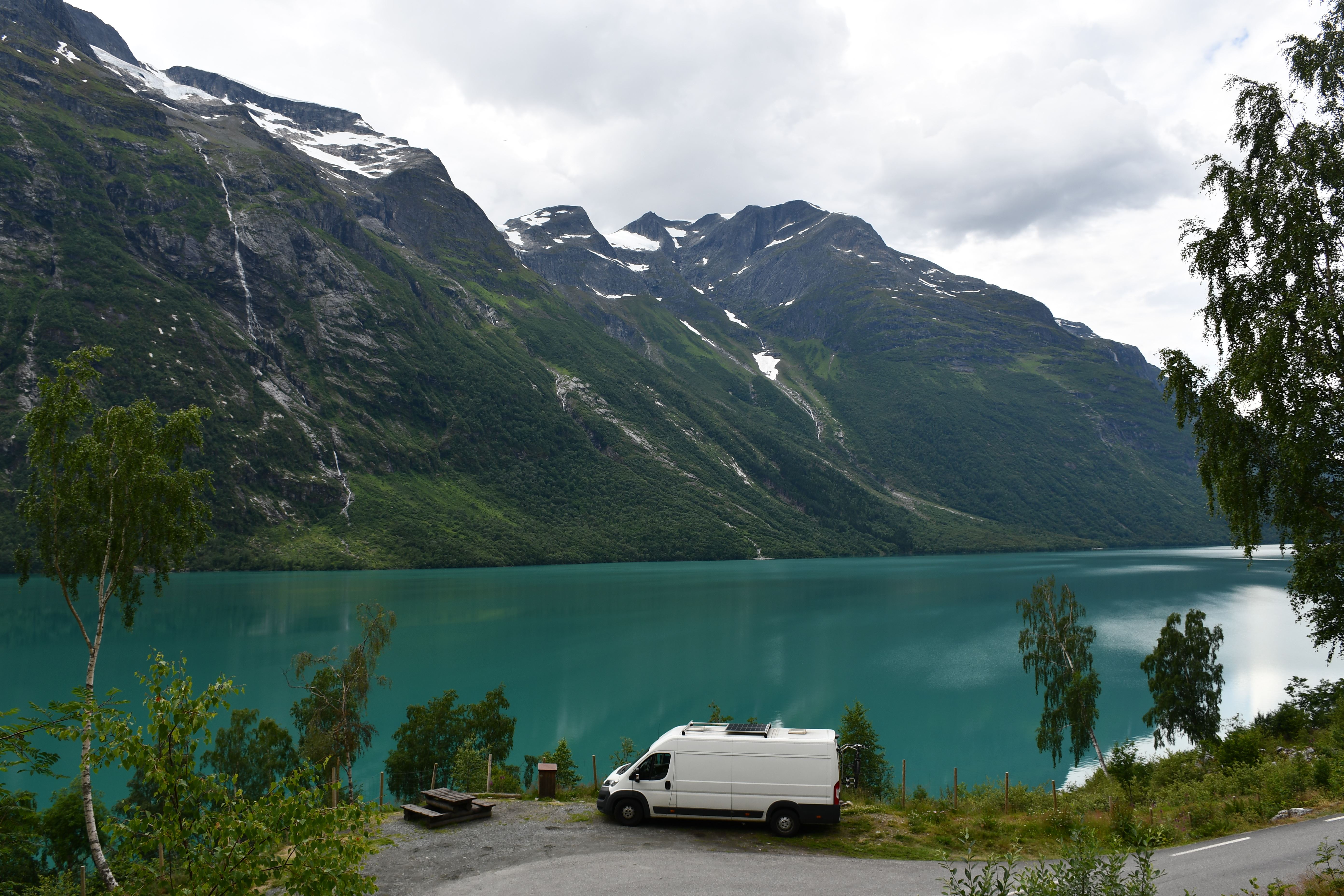Zunächst parke ich mein rollendes Zuhause unterhalb am Flusslauf und erkunde den See per Fahrrad. Die einseitig einspurig angelegte Straße bietet neben sinnvollen Ausweichstellen für die lauffaulen Touristen im Auto vor allem sensationelle Blicke auf die massiven Berge, Gletscher und eine hohe Dichte an Wasserfällen. Auf meiner Tour entdecke ich ein paar wenige mögliche Spots zum stehen, von denen ich am Nachmittag einen anfahre und den Tag auf der angrenzenden Almwiese in der Sonne ausklingen lasse.