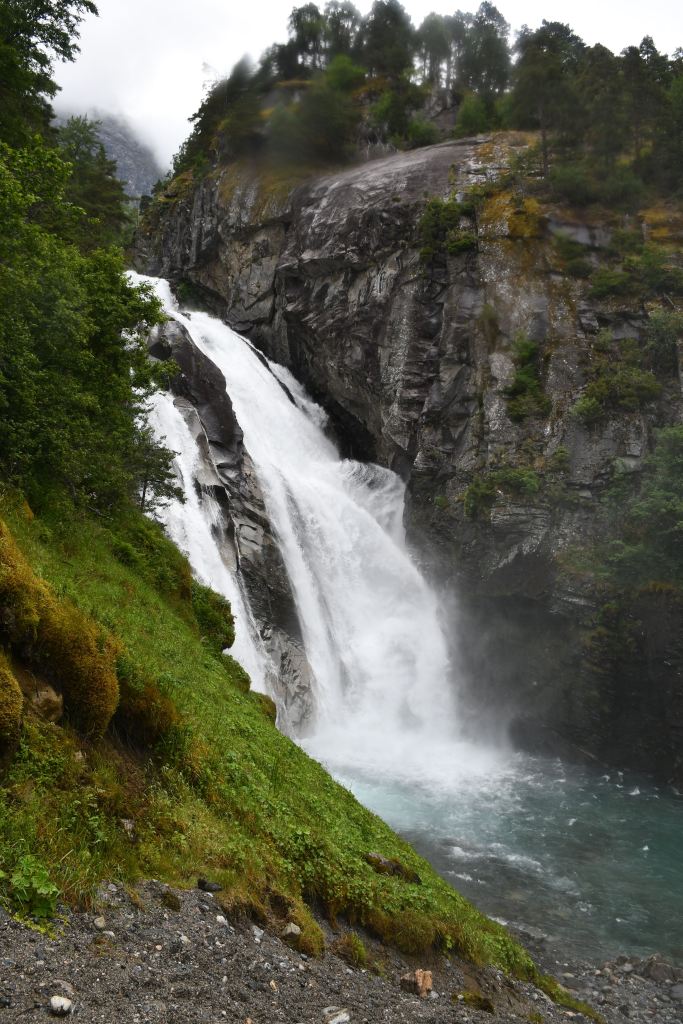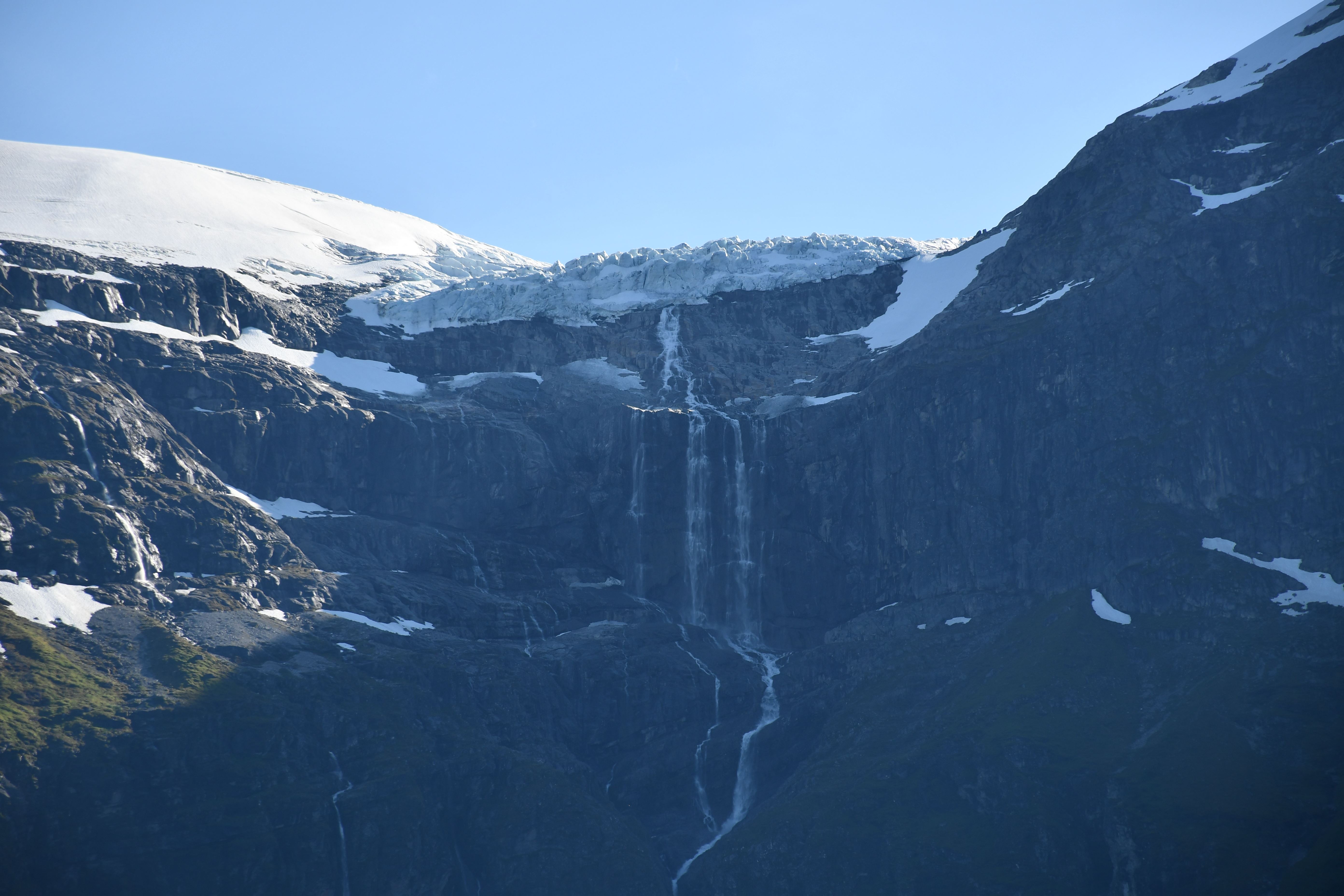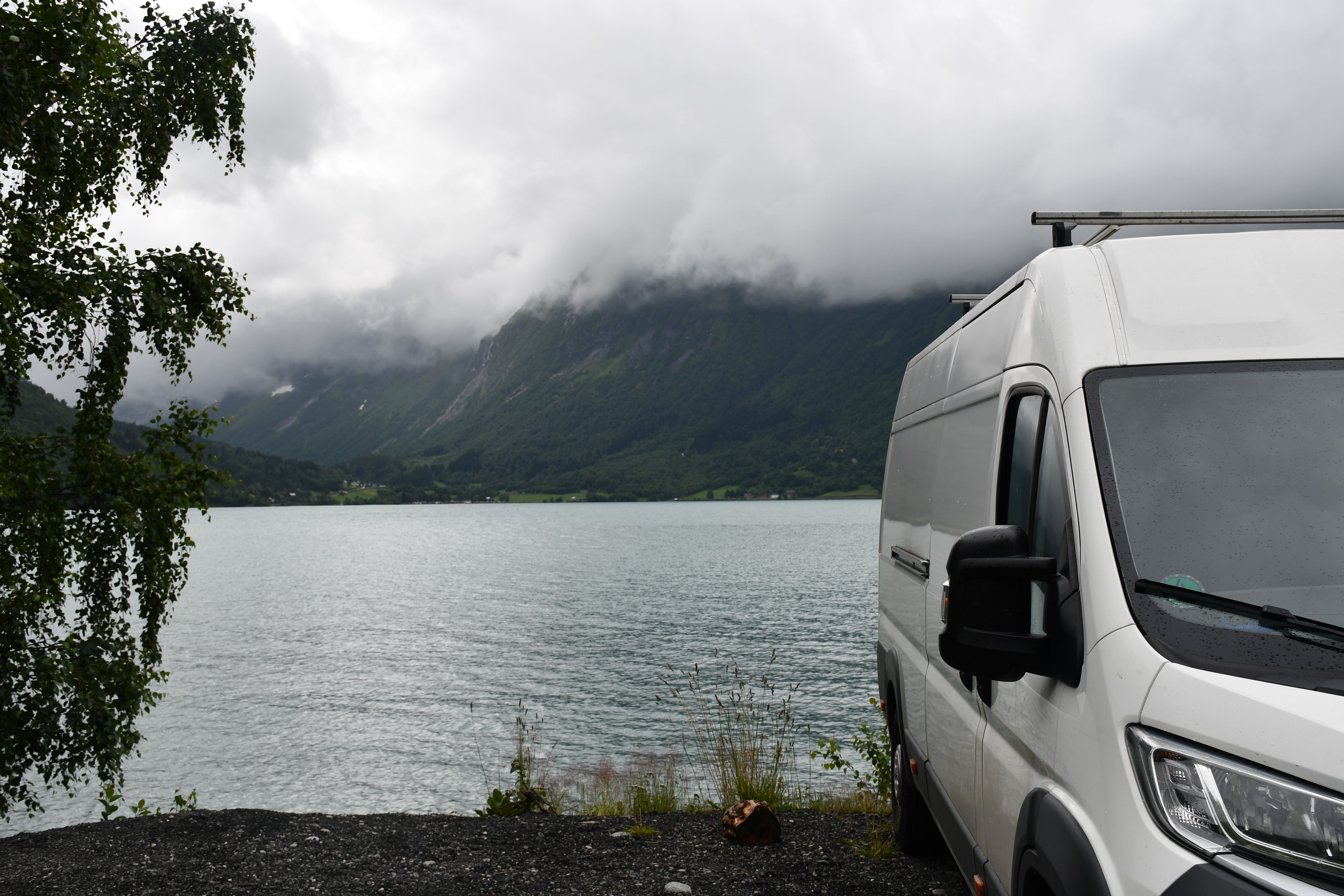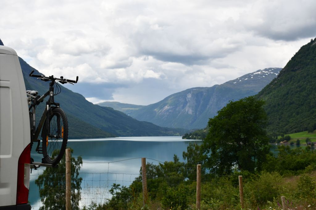 Zunächst parke ich mein rollendes Zuhause unterhalb am Flusslauf und erkunde den See per Fahrrad. Die einseitig einspurig angelegte Straße bietet neben sinnvollen Ausweichstellen für die lauffaulen Touristen im Auto vor allem sensationelle Blicke auf die massiven Berge, Gletscher und eine hohe Dichte an Wasserfällen. Auf meiner Tour entdecke ich ein paar wenige mögliche Spots zum stehen, von denen ich am Nachmittag einen anfahre und den Tag auf der angrenzenden Almwiese in der Sonne ausklingen lasse.