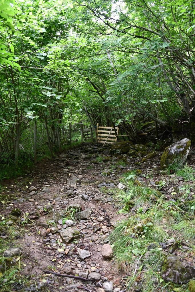 Am Nachmittag setze ich dann den zweiten Tagespunkt um. Wandern. Es ist nass, regnet aber immerhin nicht. Der Rundweg führt mich über (eigentlich) 6 Kilometer in ein naturnahes Tal hinein, überquert an zwei wunderschönen Häusern den dort verlaufenden Gebirgsbach und geht dann in einer großen Schleife durch eine extrem nasse Landschaft zu einem alten Bauerngehöft bevor es dann steil wieder bergab, an einem Wasserfall vorbei wieder an den Ausgangspunkt zurück. Am Ende schwimme ich in meinen Schuhen, so nass ist es!