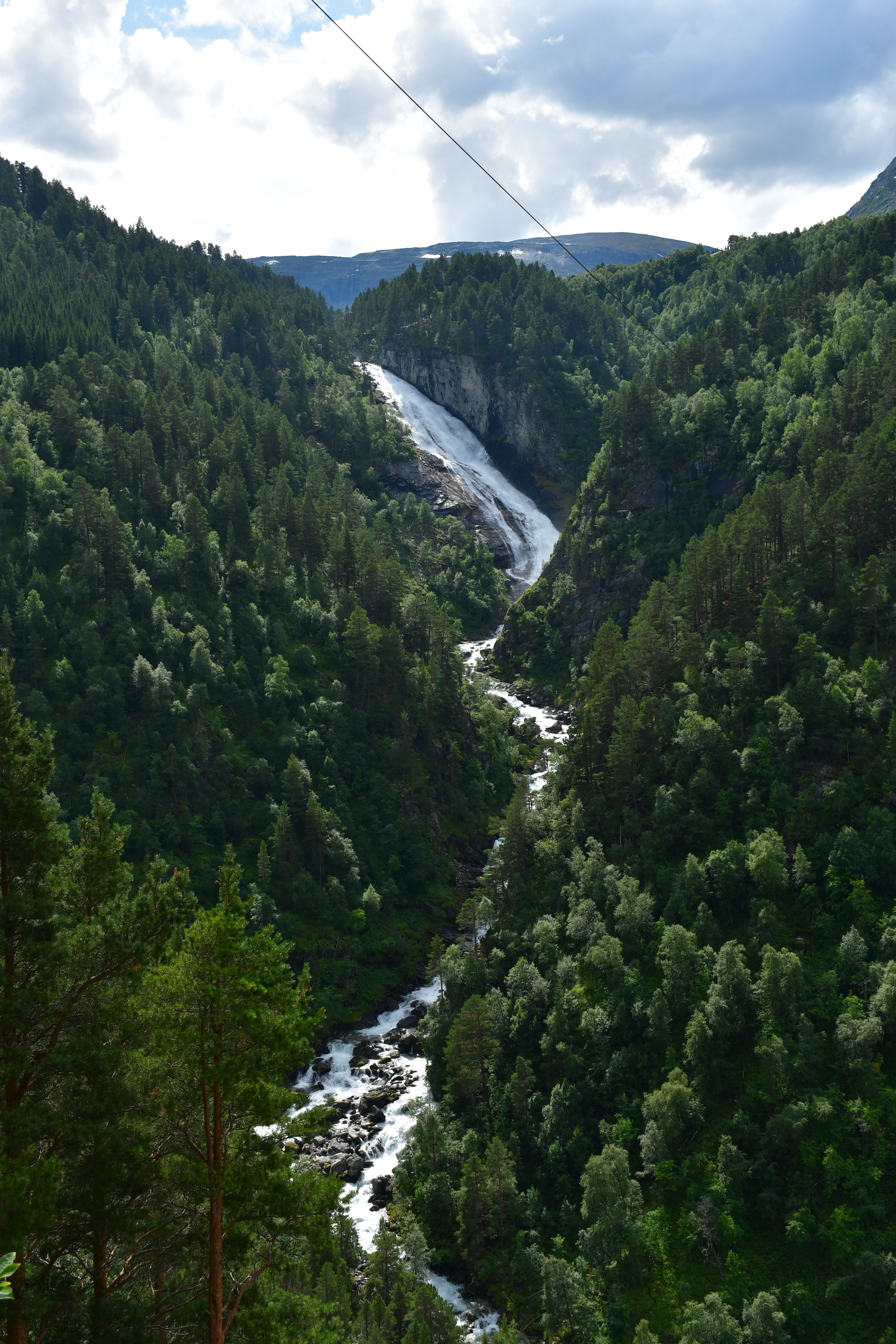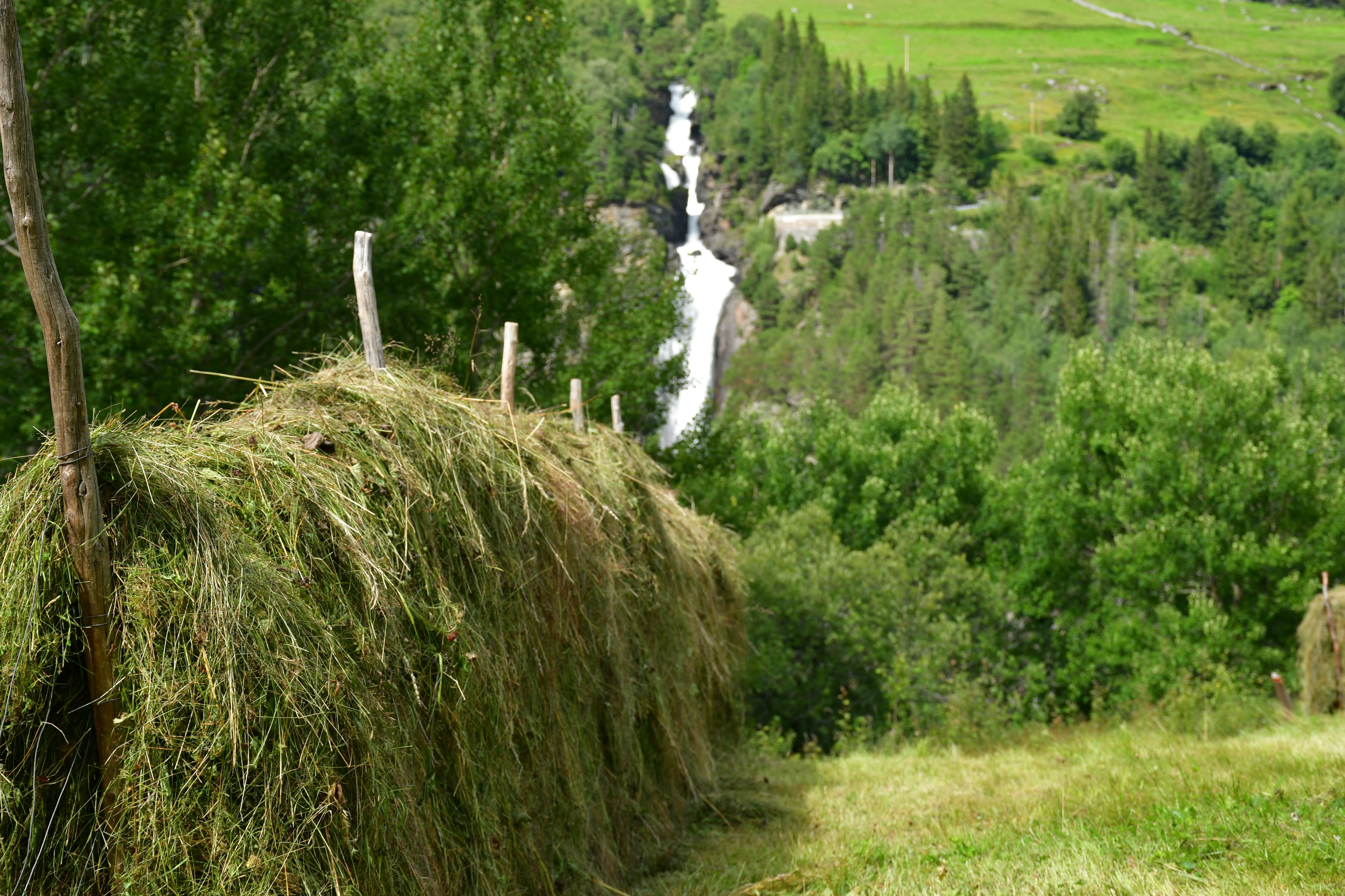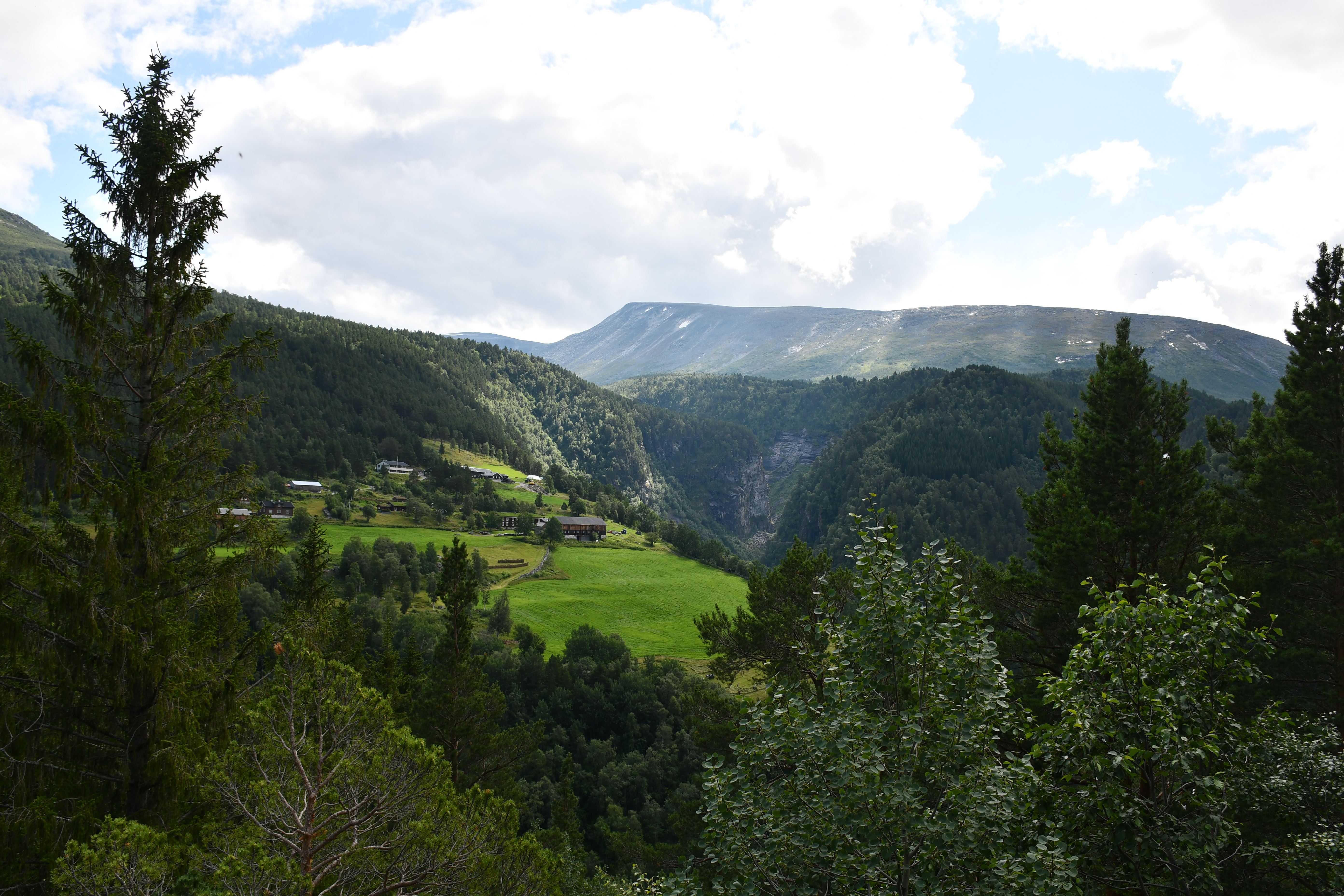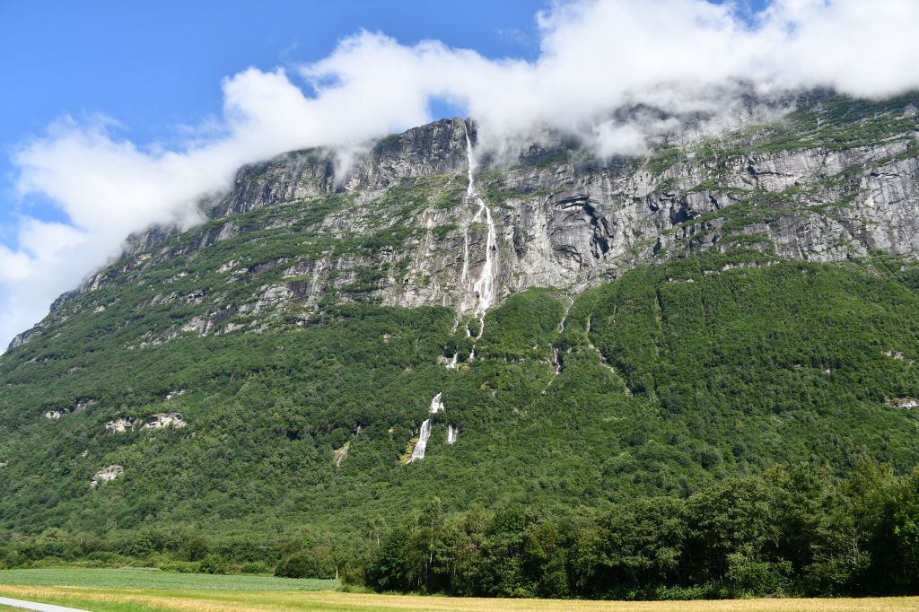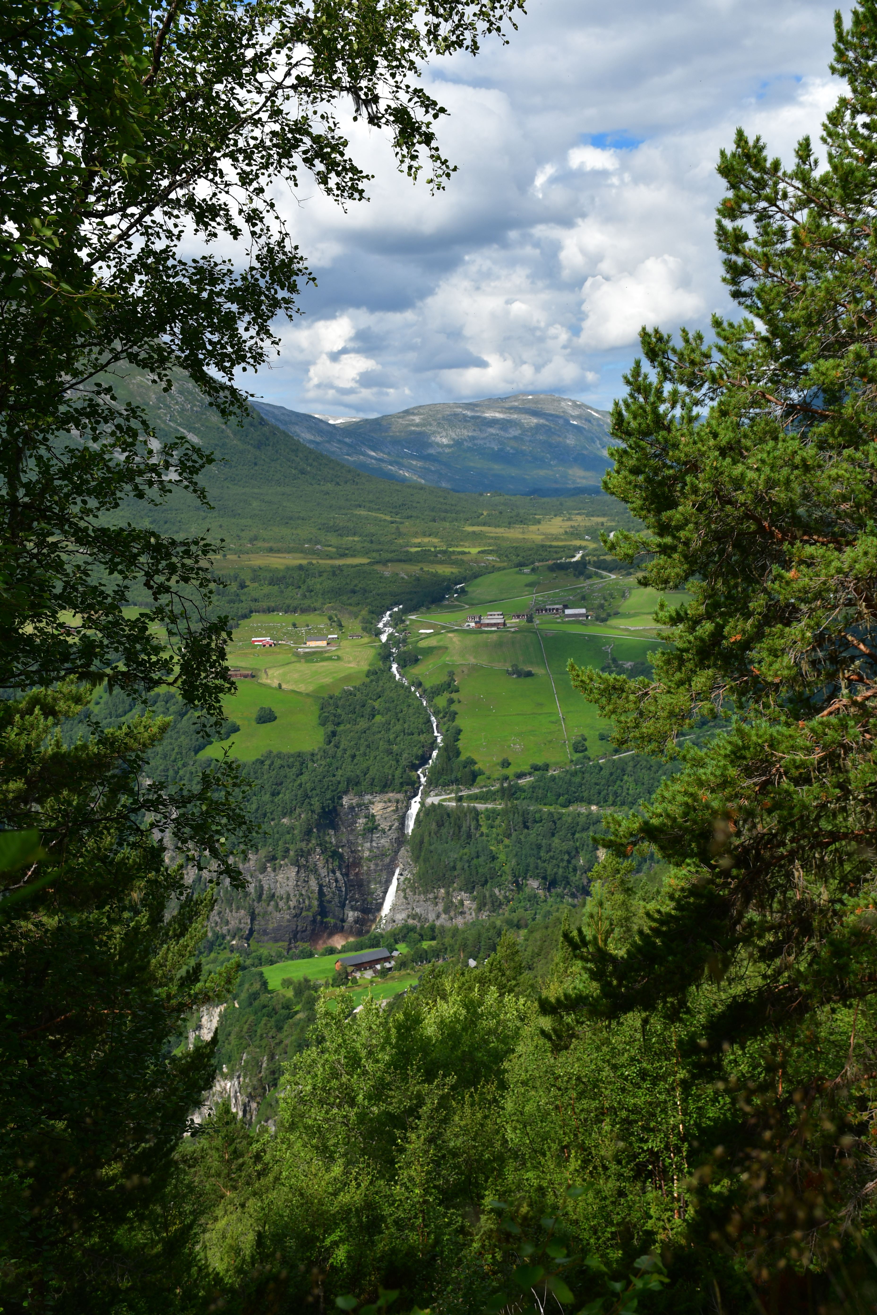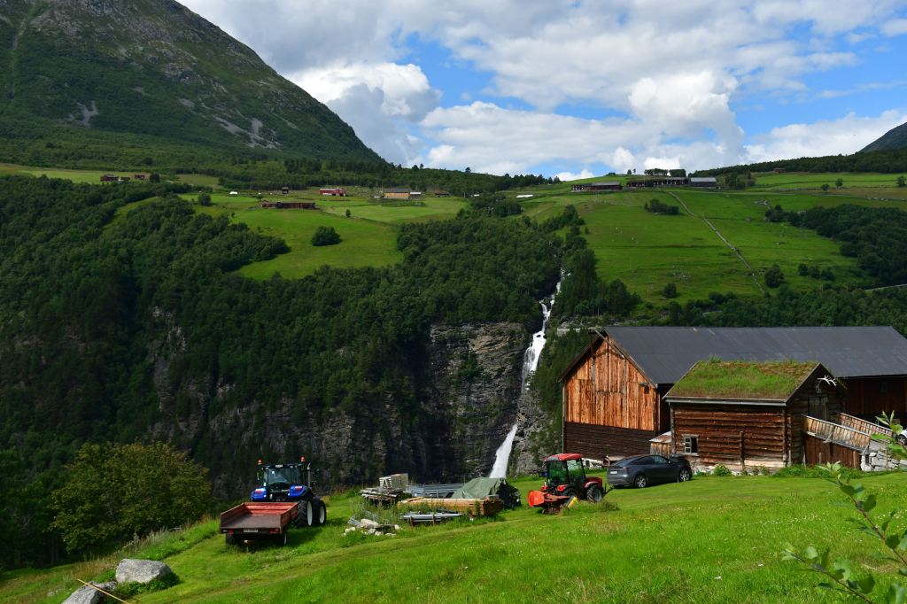 Weiter, immer weiter geht es abwärts, vorbei am Touristenparkplatz für diejenigen die weniger ambitioniert sind als ich. Unterhalb des nächsten etewas größeren Bauernhofes liegt nun der dritte Wasserfall zur linken, leider lässt sich nur ein Blick aus relativ großer Entfernung erhaschen da er sich in einem von steilen Felswänden gesäumten Teil des Tals befindet der nicht begehbar ist.