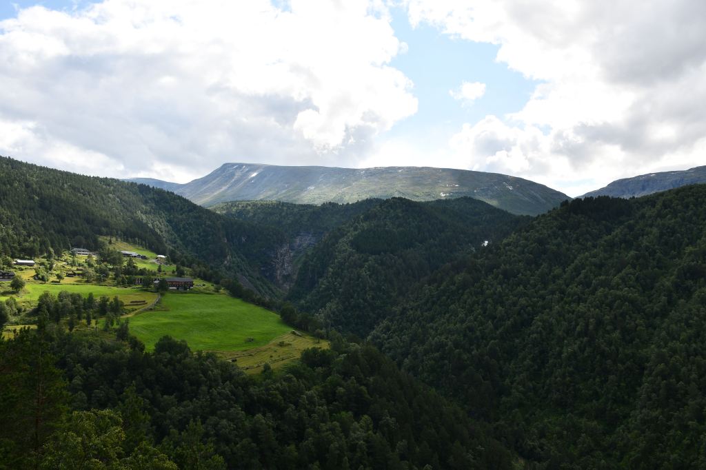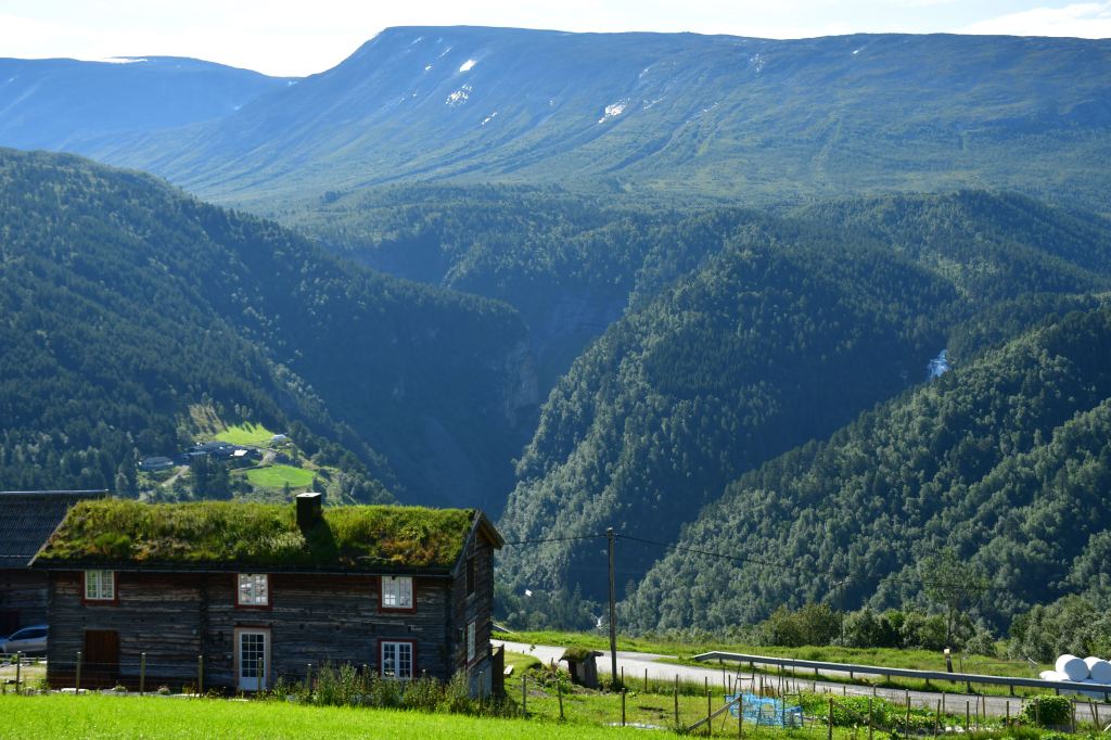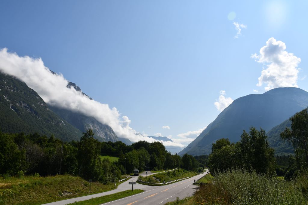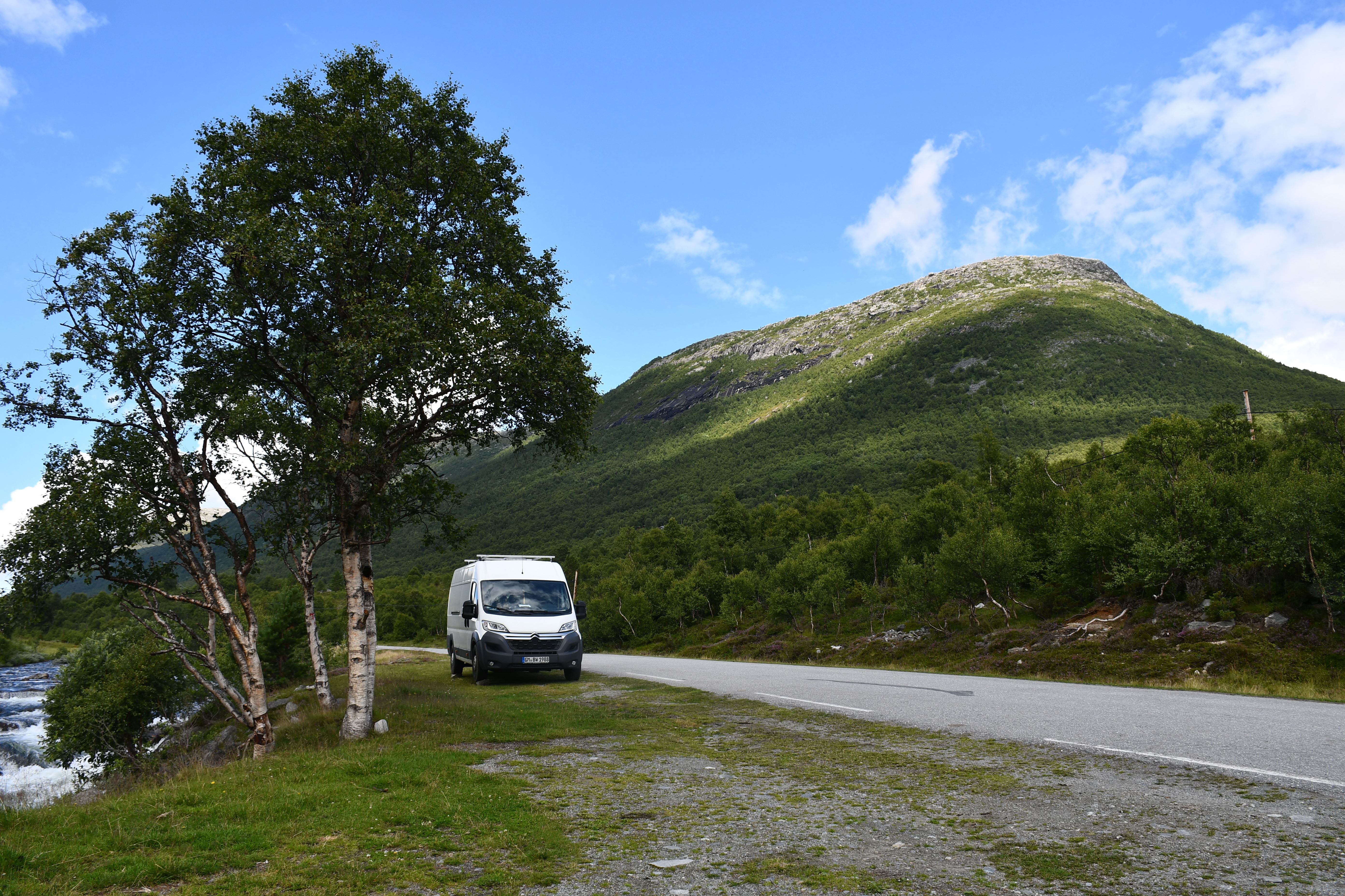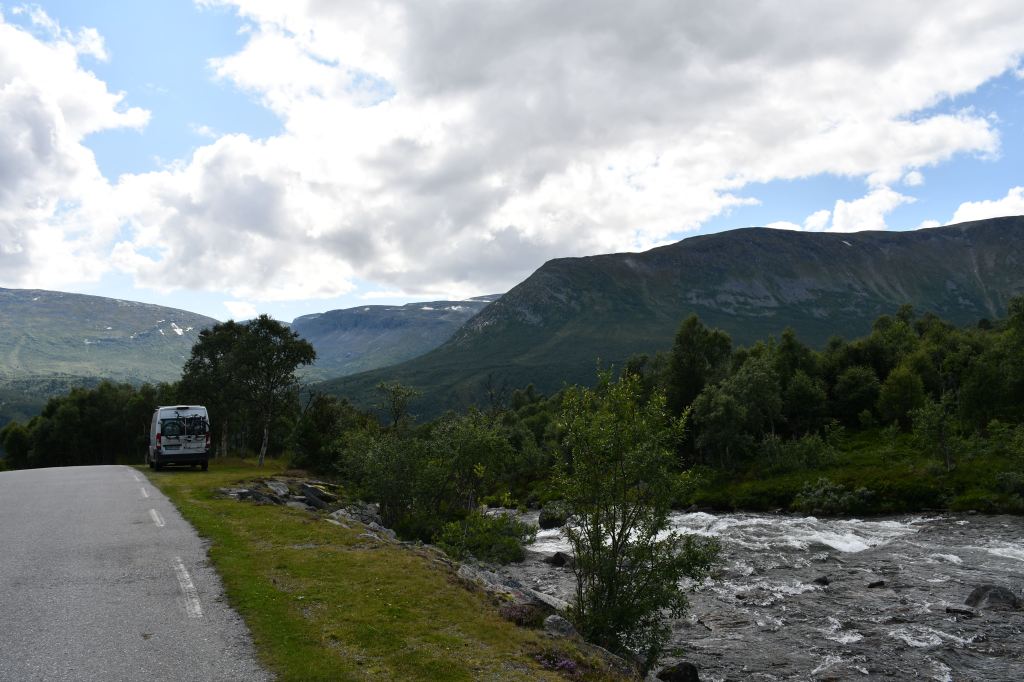 Meine Route führt mich an der kleinen Ortschaft Gjora vorbei tief in norwegisches Eingeweide. Über einspurige Serpentinenstraßen geht es mehrere hundert Höhenmeter bergauf was meinem Bus ein leises Ächzen entlockt und im Nachgang eine unangenehme Duftnote. Wer schön stehen will muss auch ein wenig leiden.