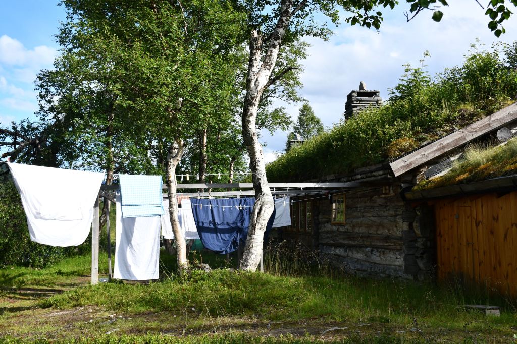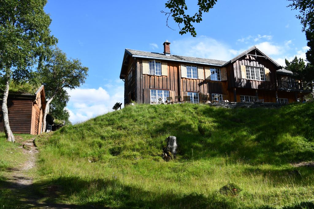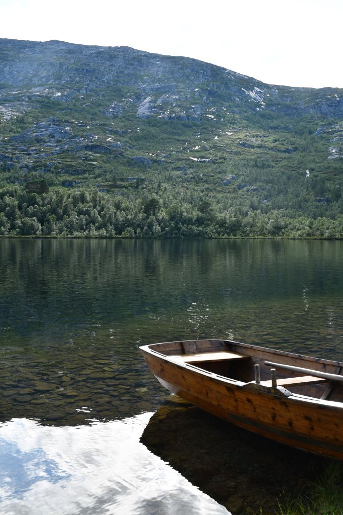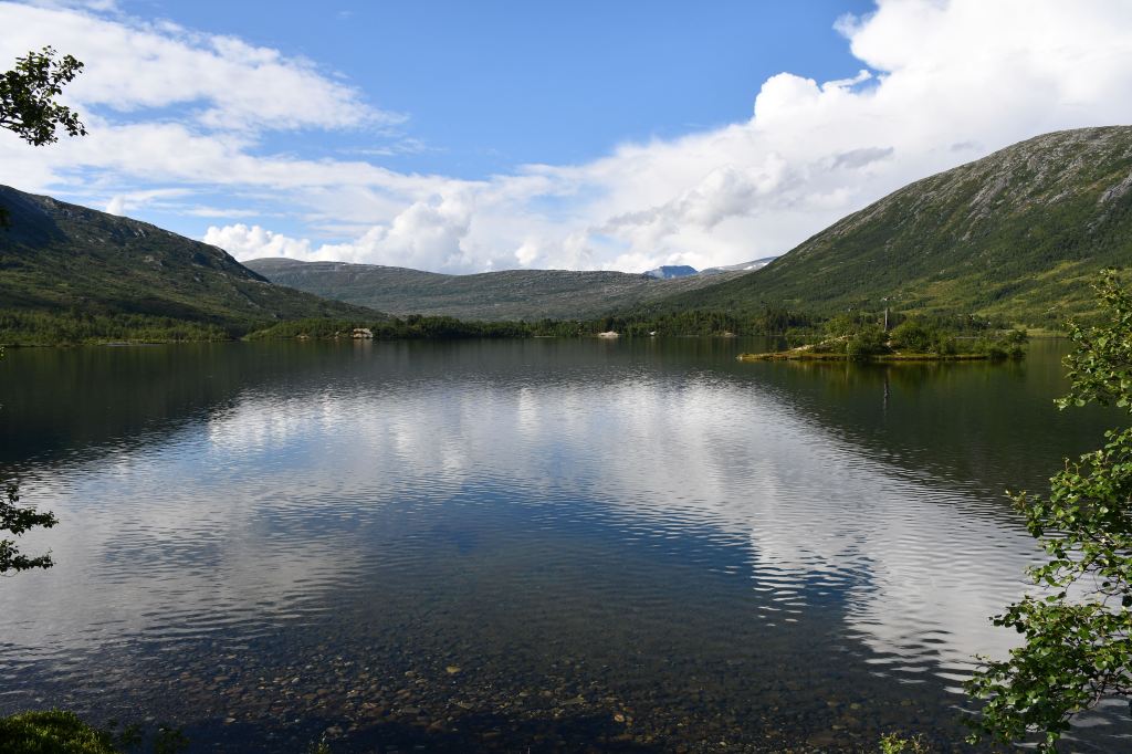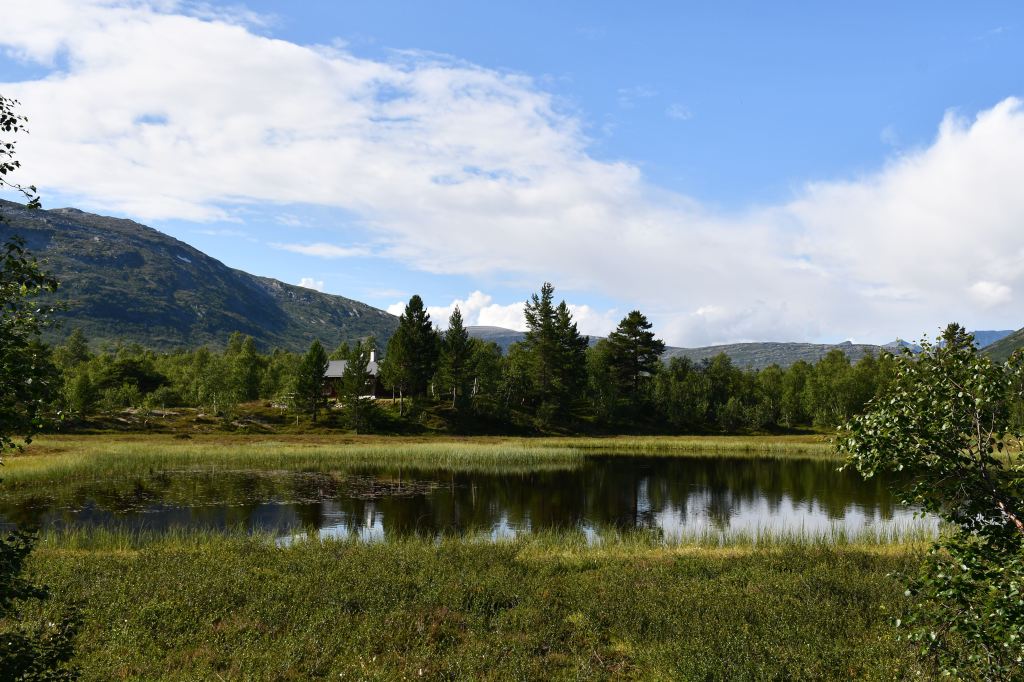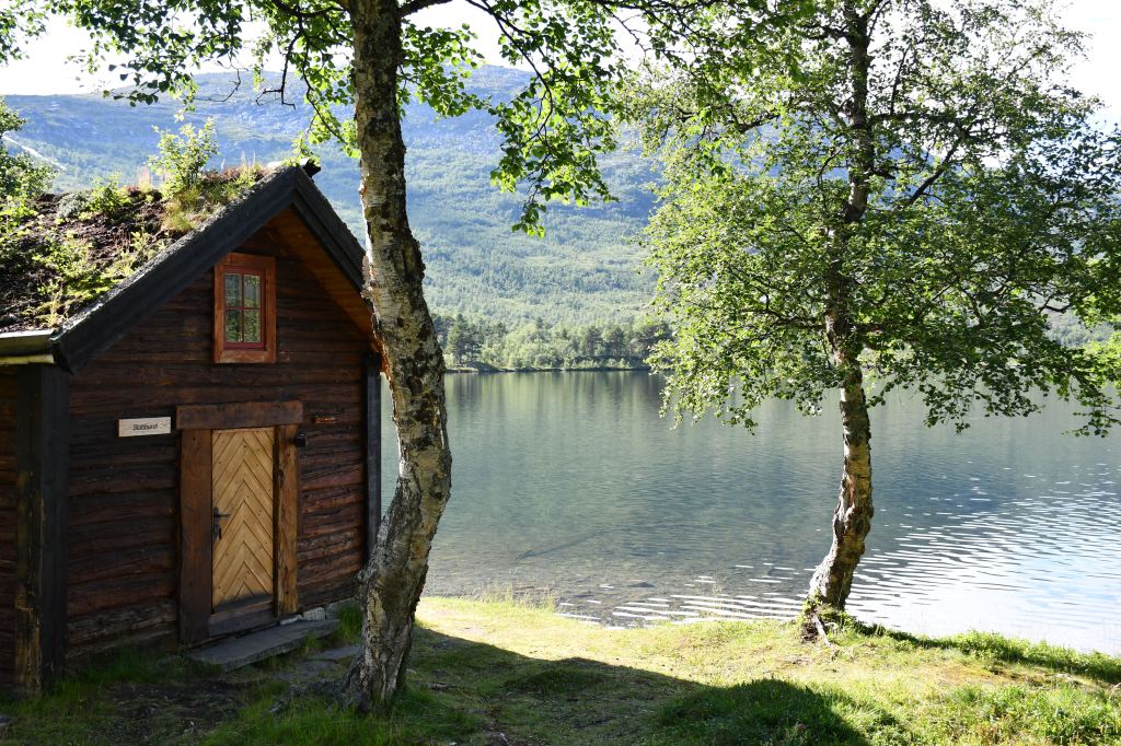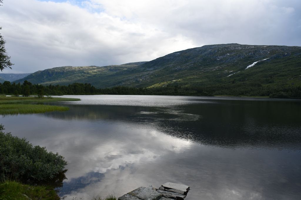 Nach moderater aber stetiger Steigung auf den ersten 3 Kilometern der die Pumpe ans laufen bringt geht es auf eine Schotterpiste. Die Höhenmeter lassen sich ab hier an verschmerzen da sie sich auf ein Minimum beschränken. Durch lichte Birkenwälder, vorbei an weitläufig verteilten Sommerhäusern geht es tiefer in das Tal hinein. Angekommen am Storovatnet erwartet mich (mal wieder) ein absoluter Highlightort. Wobei ehrlicherweise hier fast alles seit Wochen Highlights sind. Direkt am Seeablauf schmiegt sich auf einer kleinen Erhöhung das DNT Vangshaugen. Hier kann man es sich als Gast/Gästin kulinarisch erfrischen, Zimmer mieten oder sein Zelt aufschlagen. Nebenbei bietet der See und die Flüsse herausragende Möglichkeiten auf Bachforellenjagd zu gehen. Zu Fuß oder mit einem Kanu. Absolut traumhaft!