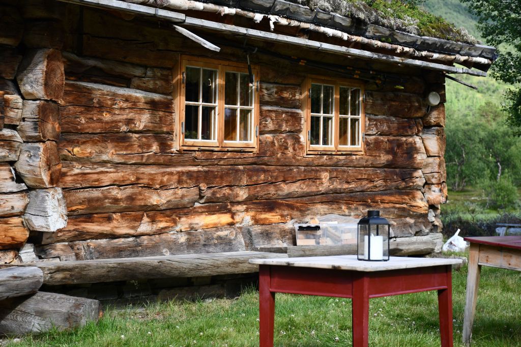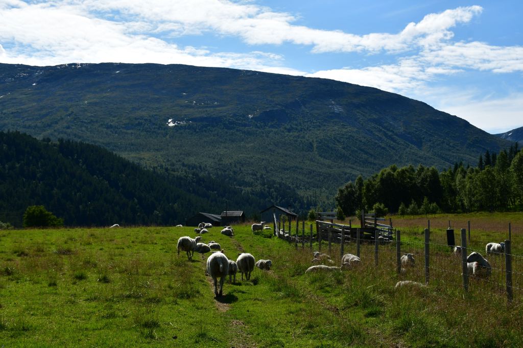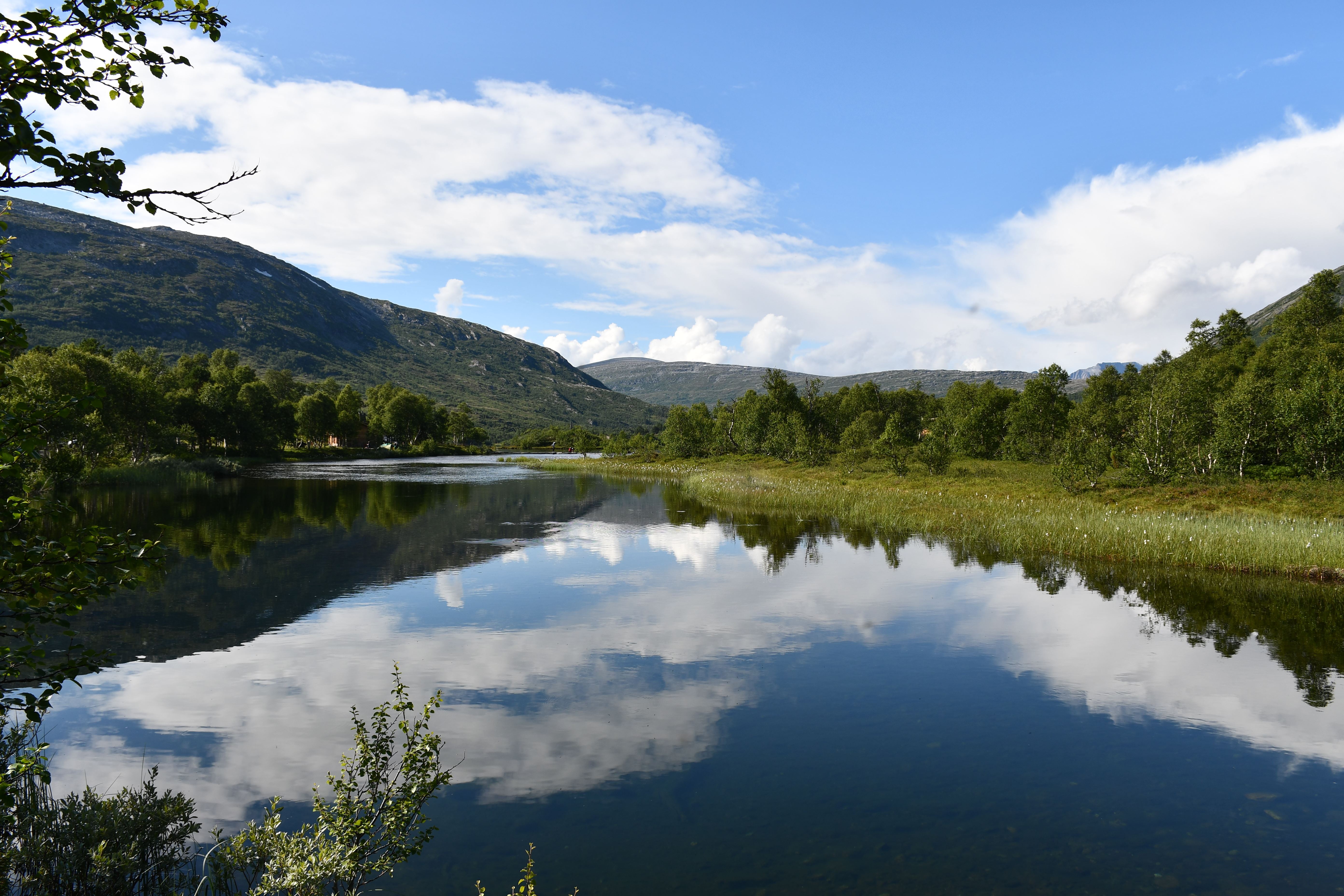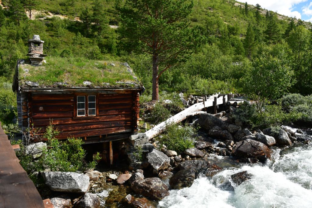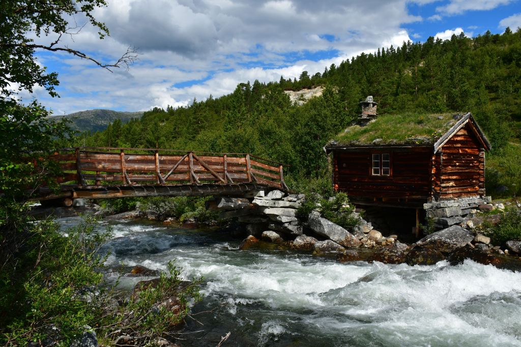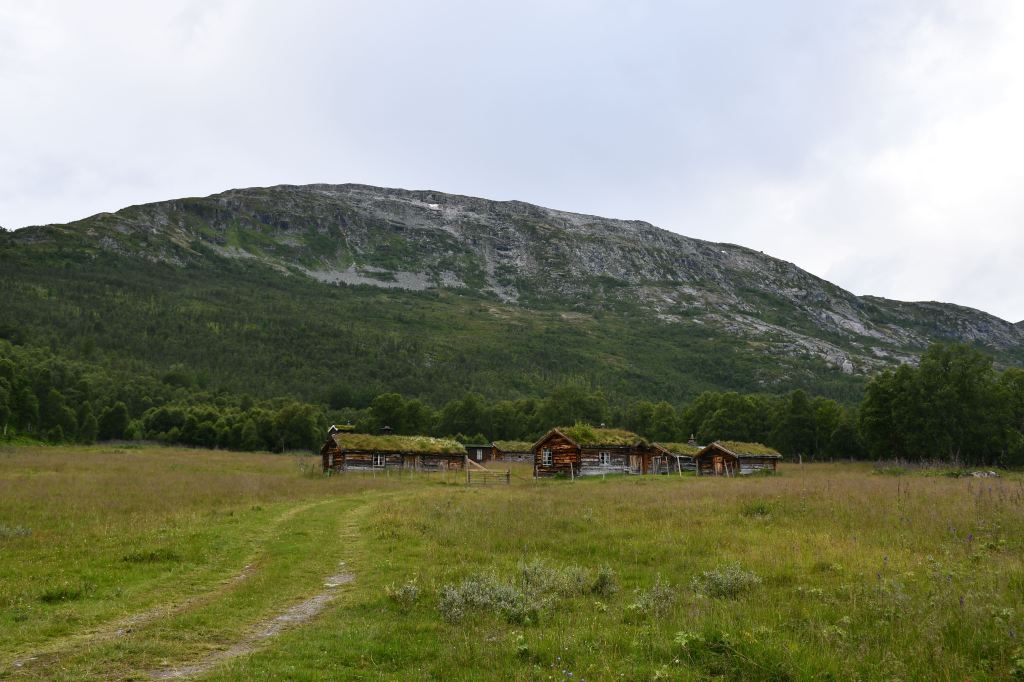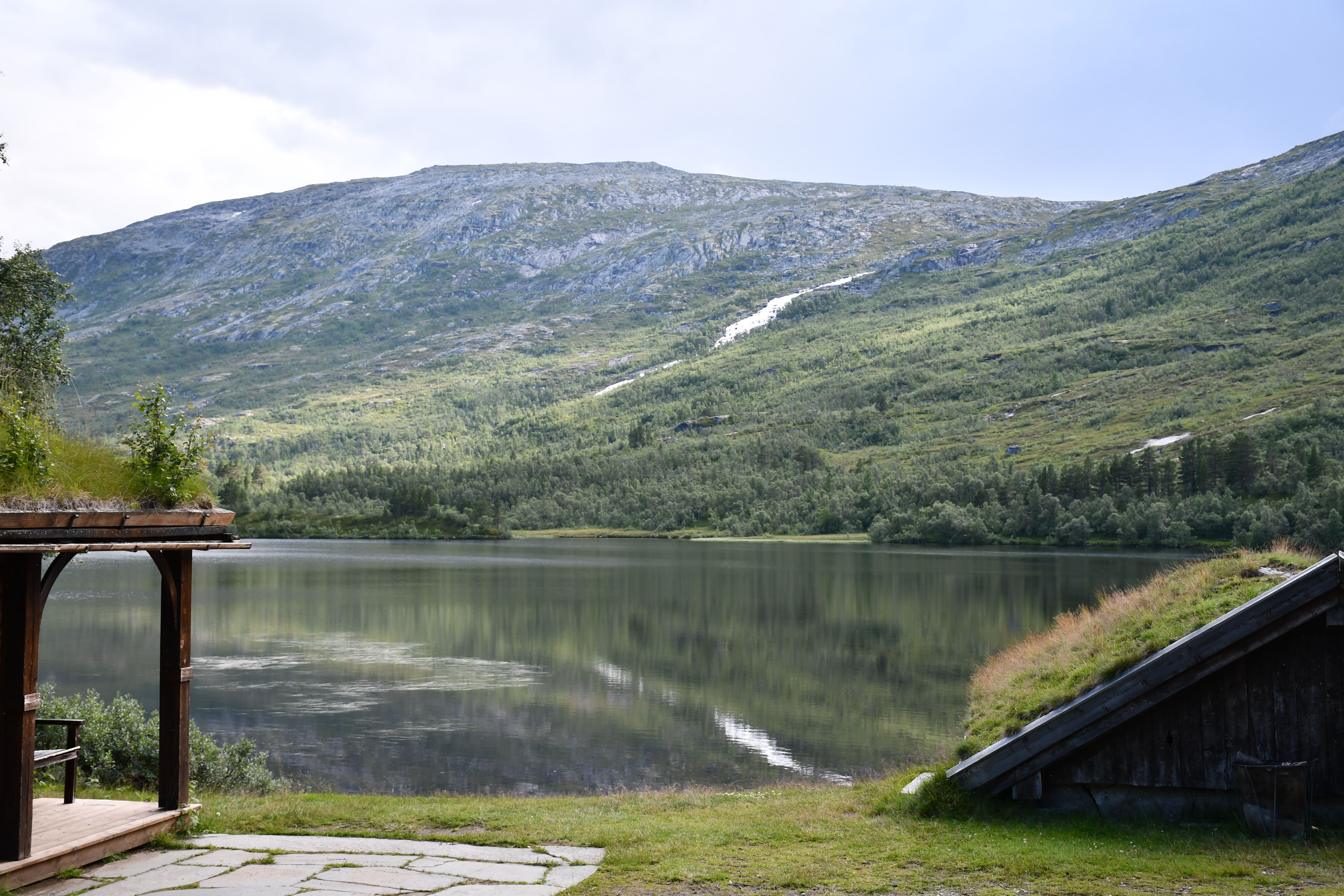 Nach moderater aber stetiger Steigung auf den ersten 3 Kilometern der die Pumpe ans laufen bringt geht es auf eine Schotterpiste. Die Höhenmeter lassen sich ab hier an verschmerzen da sie sich auf ein Minimum beschränken. Durch lichte Birkenwälder, vorbei an weitläufig verteilten Sommerhäusern geht es tiefer in das Tal hinein. Angekommen am Storovatnet erwartet mich (mal wieder) ein absoluter Highlightort. Wobei ehrlicherweise hier fast alles seit Wochen Highlights sind. Direkt am Seeablauf schmiegt sich auf einer kleinen Erhöhung das DNT Vangshaugen. Hier kann man es sich als Gast/Gästin kulinarisch erfrischen, Zimmer mieten oder sein Zelt aufschlagen. Nebenbei bietet der See und die Flüsse herausragende Möglichkeiten auf Bachforellenjagd zu gehen. Zu Fuß oder mit einem Kanu. Absolut traumhaft!