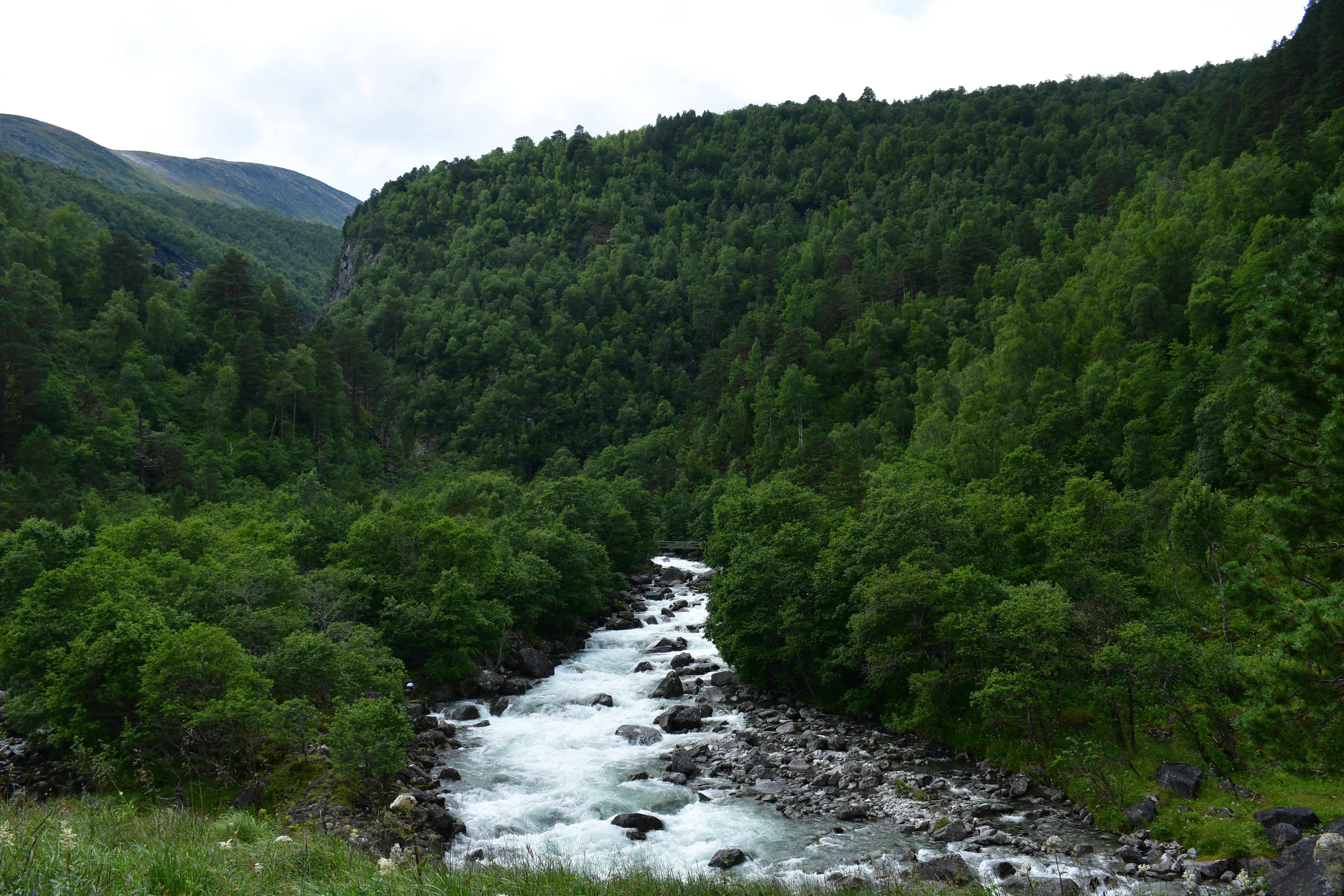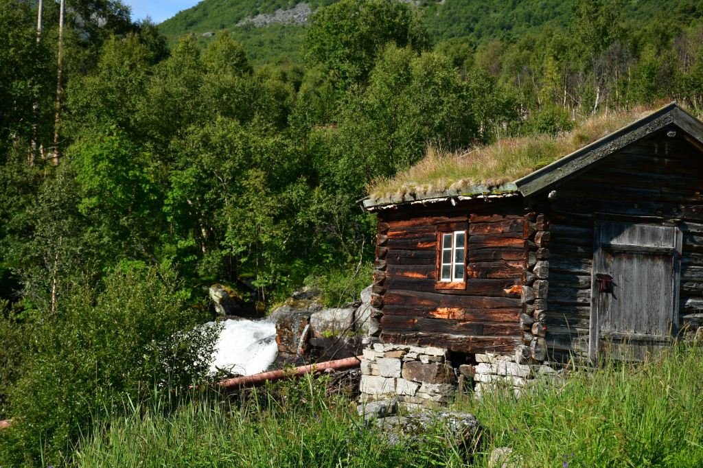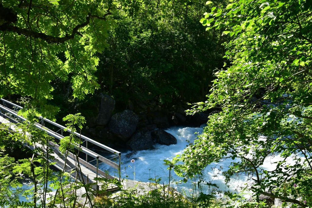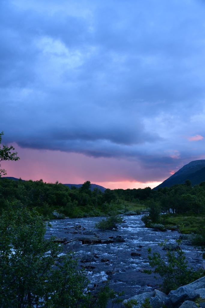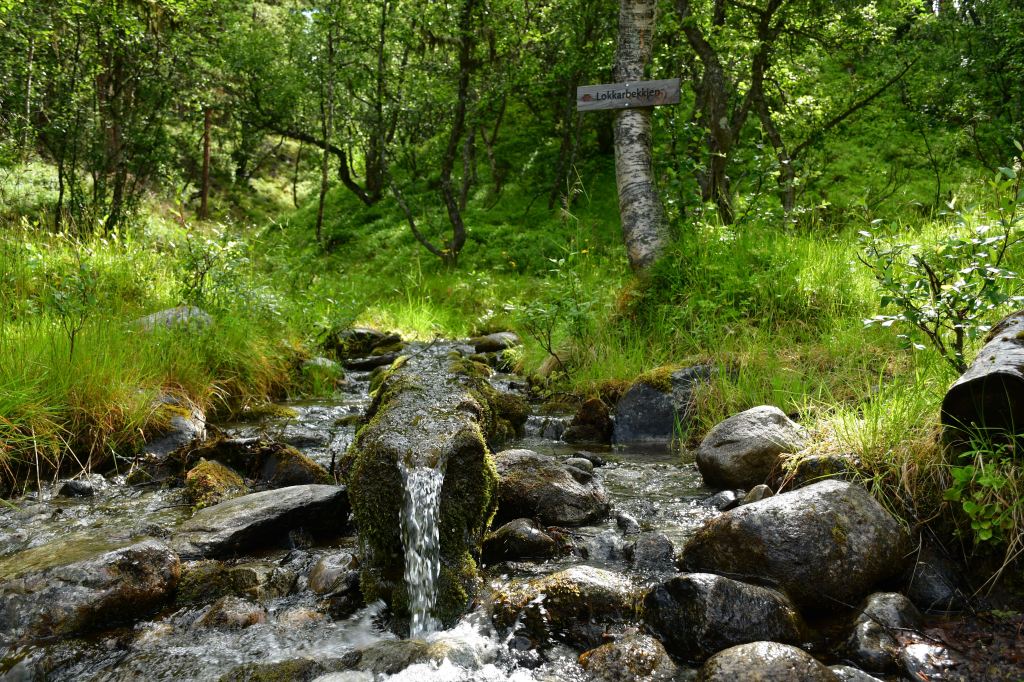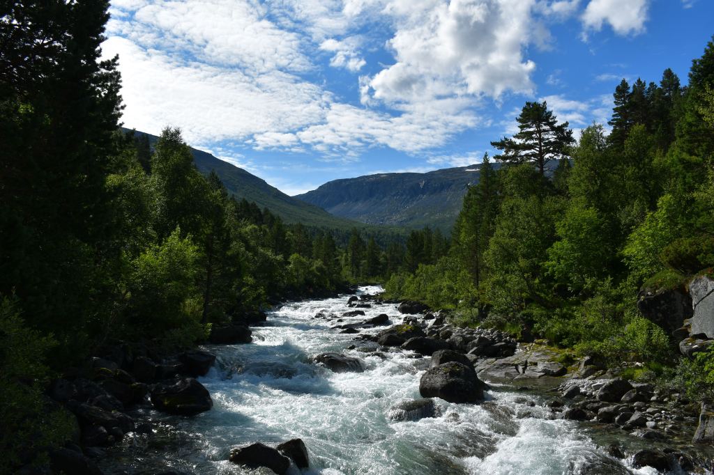 Ankommen tue ich schließlich oberhalb der letzten Bauernhöfe am Beginn des hoch gelegenen Tales. Drei Meter neben mir erklingt das dauerhafte Rauschen des vom höher gelegenen Storvatnet gespeisten Bergflusses, Natur kann offensichtlich auch laut sein. Etwas weiter unterhalb entdecke ich eine etwas tiefere von der Strömung abgeschnittene Mulde in der es sich herausragend baden lässt. Kalt. Aber geil.