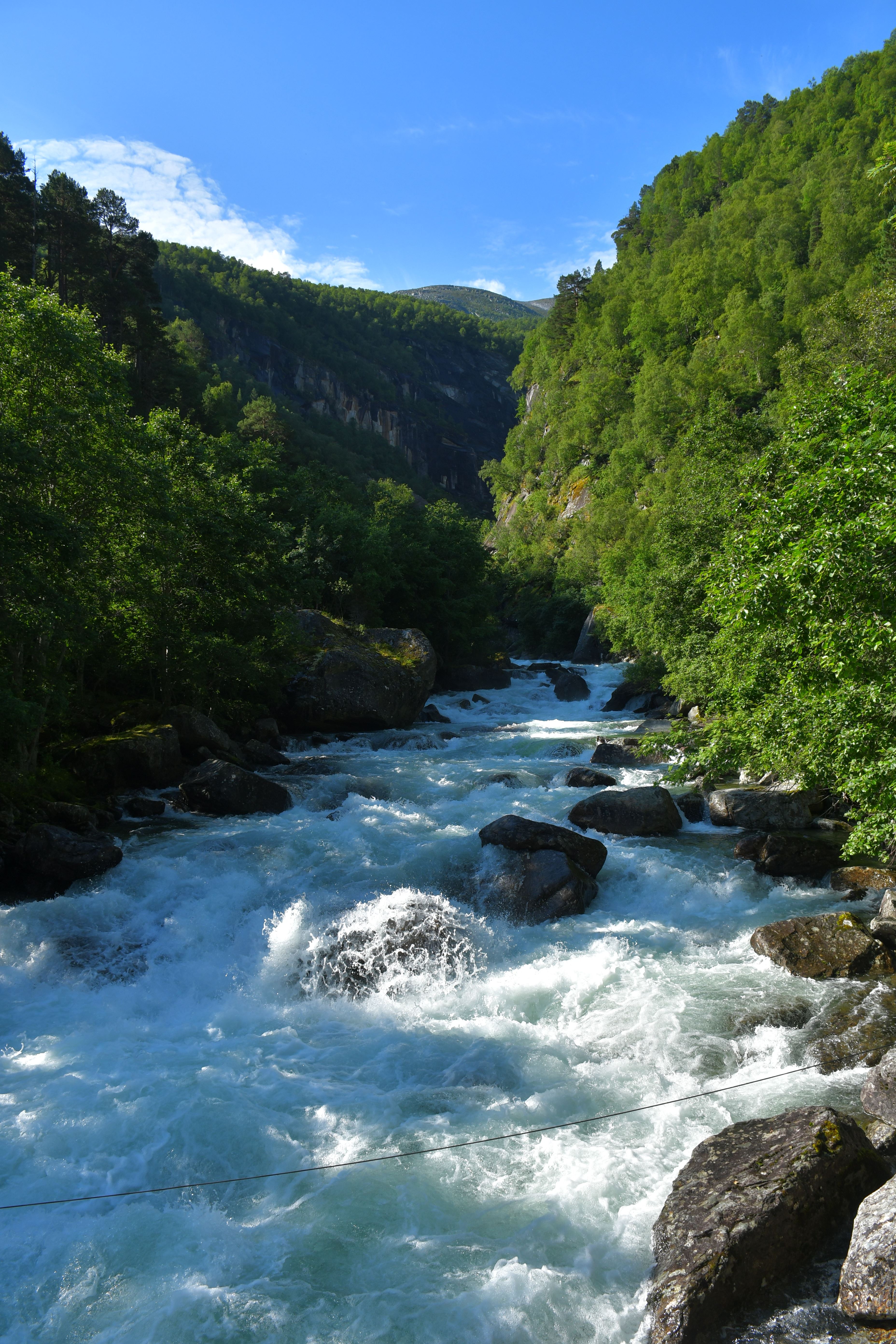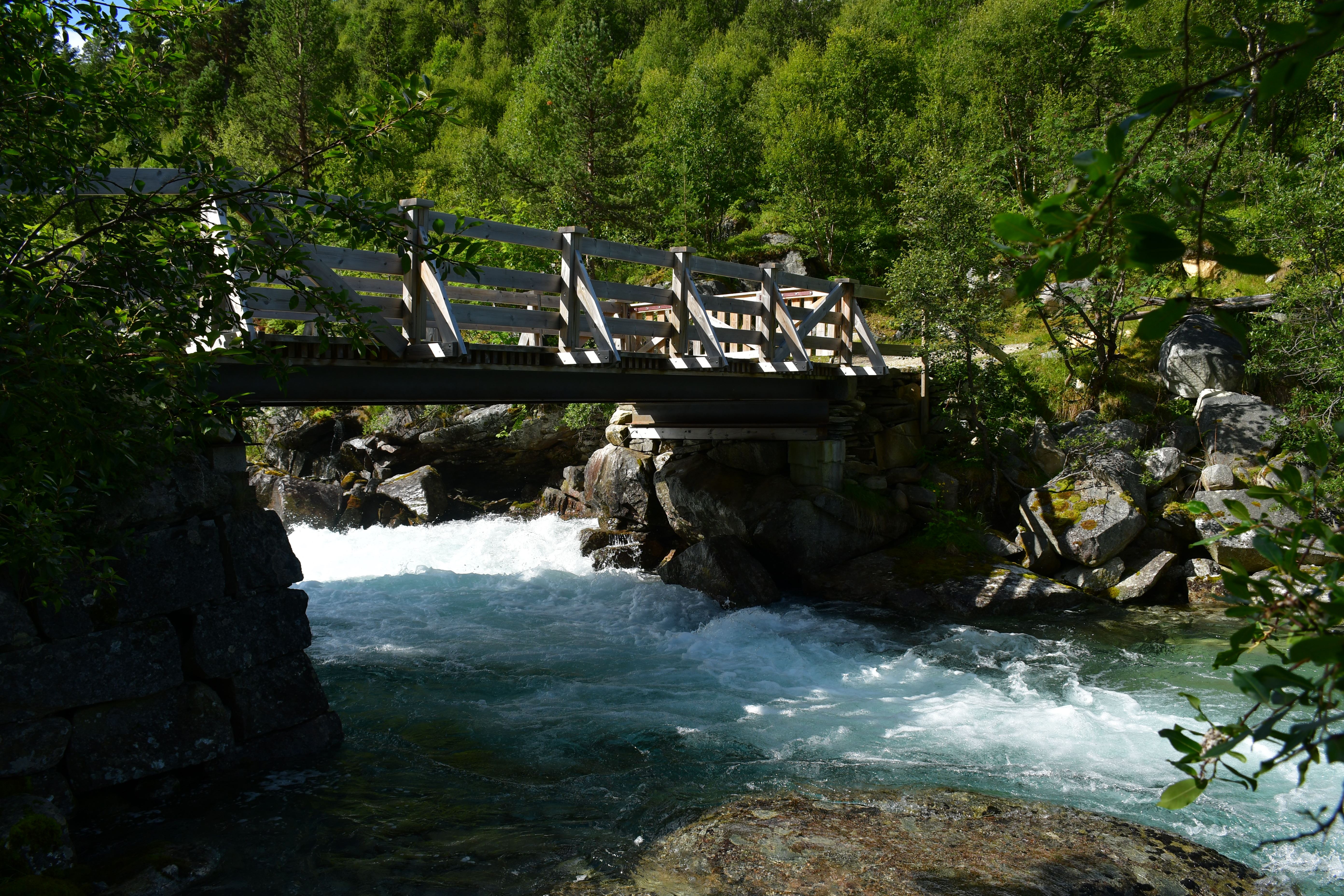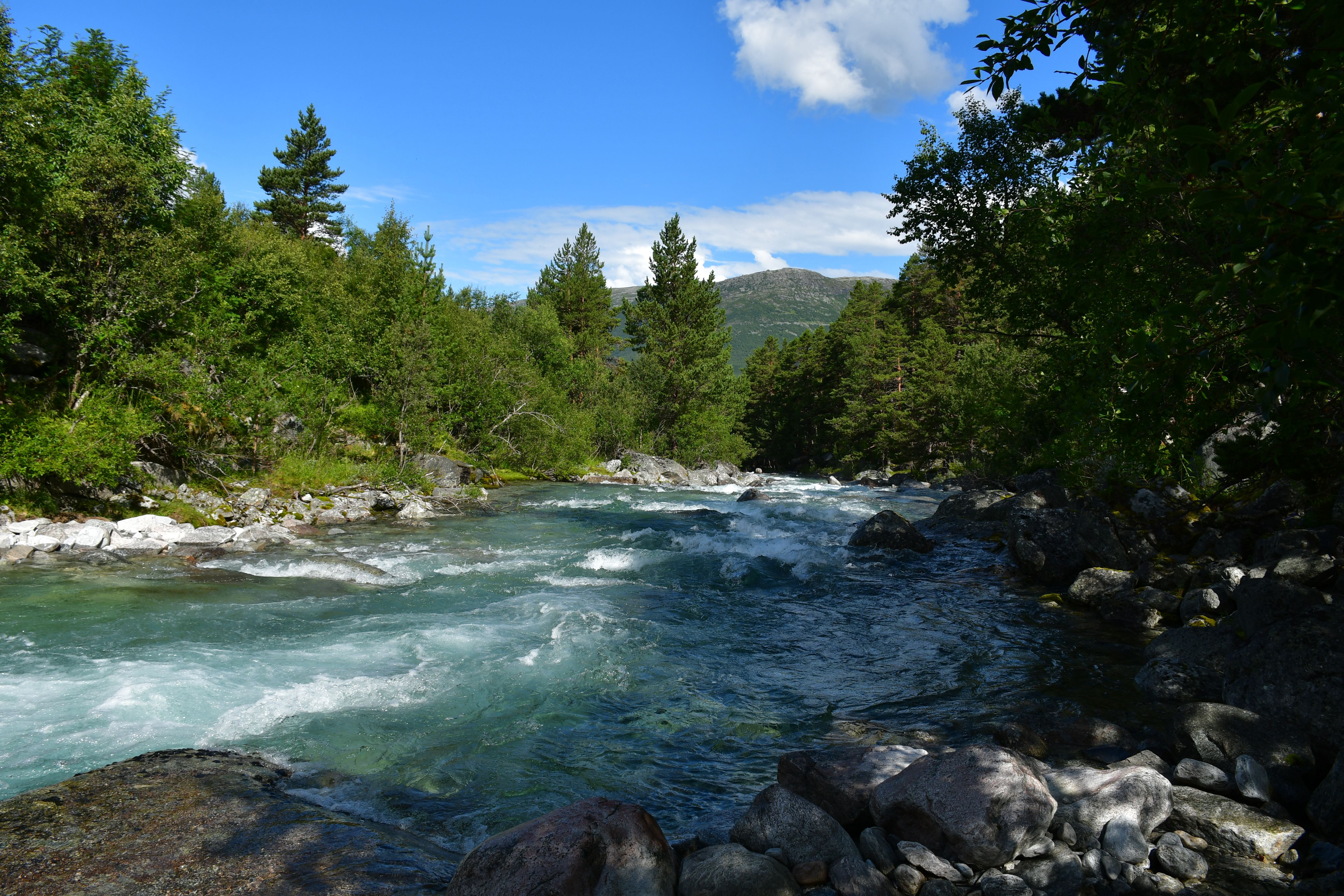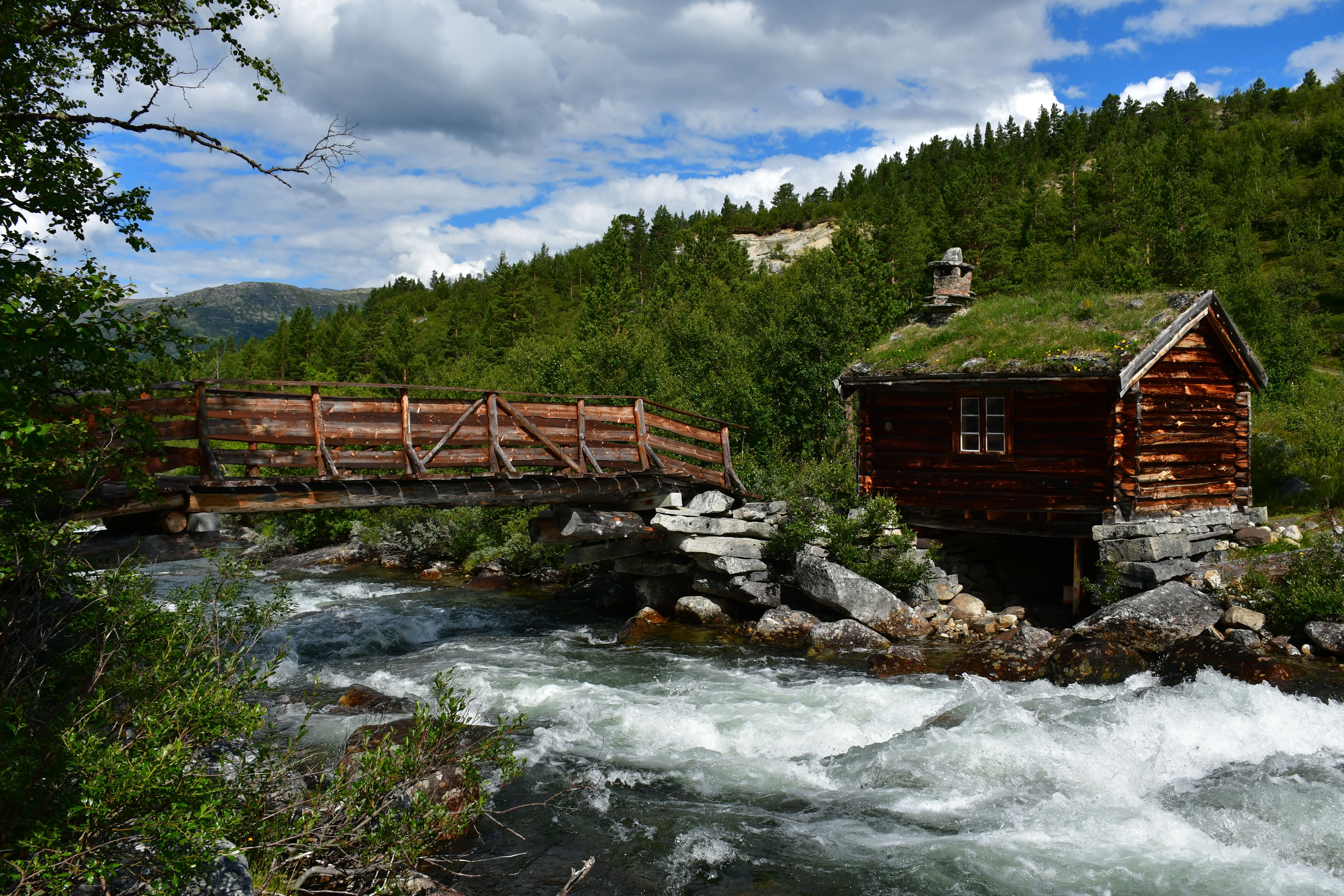 Ankommen tue ich schließlich oberhalb der letzten Bauernhöfe am Beginn des hoch gelegenen Tales. Drei Meter neben mir erklingt das dauerhafte Rauschen des vom höher gelegenen Storvatnet gespeisten Bergflusses, Natur kann offensichtlich auch laut sein. Etwas weiter unterhalb entdecke ich eine etwas tiefere von der Strömung abgeschnittene Mulde in der es sich herausragend baden lässt. Kalt. Aber geil.