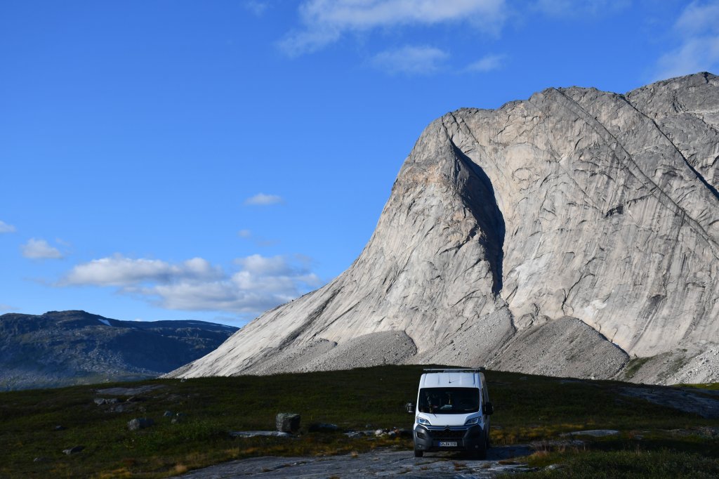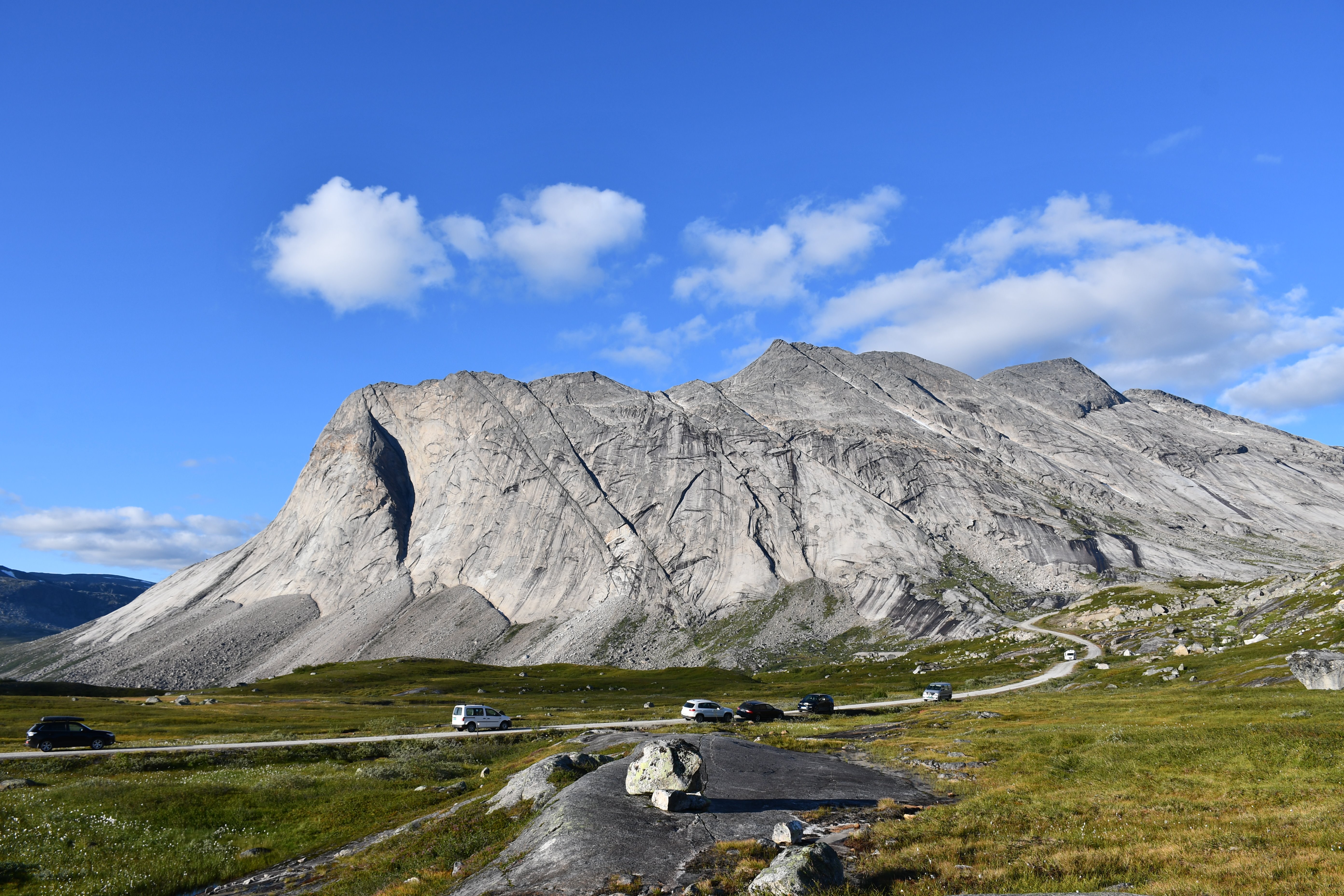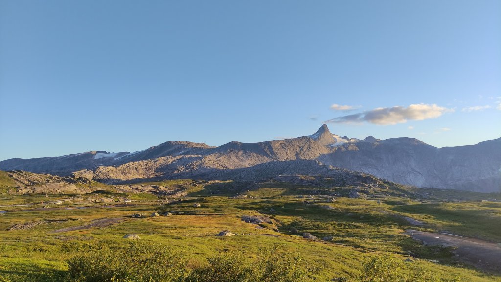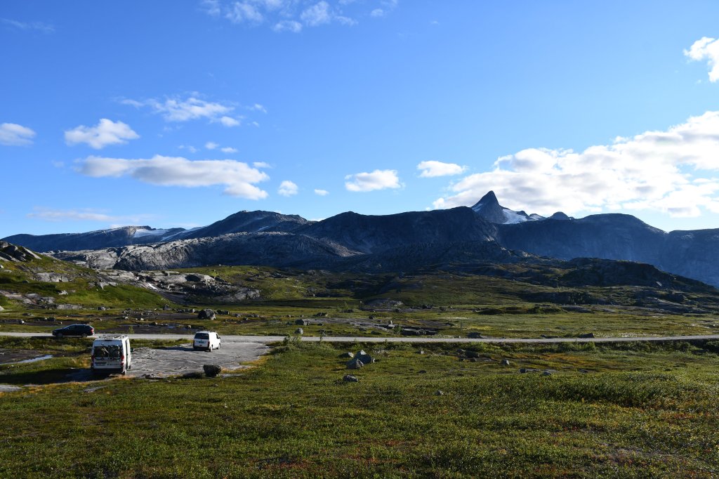 Nachdem ich den 26.08. mit einkaufen, Recherche, dem fangen von drei Makrelen (welche traumhaft geschmeckt haben) und der 15:30Uhr Bundesligakonferenz vertrödelt habe, komme ich nach einer 16km Schotterpistenfahrt im Hochgebirge an. Erstaunlich viele Tagestouristen sind unterwegs (100% Norweger), was im Nachgang wohl am Wochenende lag. Am heutigen Sonntag bin ich der einzig verbliebene. Die Wanderung habe ich dementsprechend nicht mehr am Samstagnachmittag/-abend gemacht, sondern bin am heutigen Sonntag nach einem ausgiebigem Frühstück um 9Uhr los gewandert.