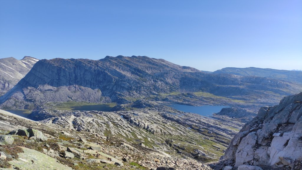 Die Route, welche interessanterweise in keiner mir bekannten App (hätte mir sowieso wenig gebracht weil hier 0,0 Netz ist) hinterlegt ist, ist auch keine Wanderroute im eigentlichen Sinn. Es gibt keinerlei Beschilderung oder Wegmarkierungen, der anfängliche ausgelaufene Pfad löst sich nach den ersten Kilometern in Wohlgefallen auf sodass es im weitesten Sinne freischnauze immer der Nase nach geht. Orientierung gibt mir die sehr spartanisch zu findenden Steinhaufen früherer Wanderer und das Infoblatt welches ich glücklicherweise mitgenommen hatte. Hier ist auf einer Karte neben der Route wichtige Landmarken wie Bergseen, Gletscher und Höhenmeter aufgeführt. An diesen kann ich mich in den meisten Fällen grob orientieren sodass es mir am Ende ohne größere Umwege gelingt den Gipfel zu erklimmen. Mit noch leicht nachwirkendem Muskelkater von der Wanderung vor zwei Tagen komme ich insgesamt (auch mit Hinblick auf mein Knie) in die Nähe meiner körperlichen Grenze.