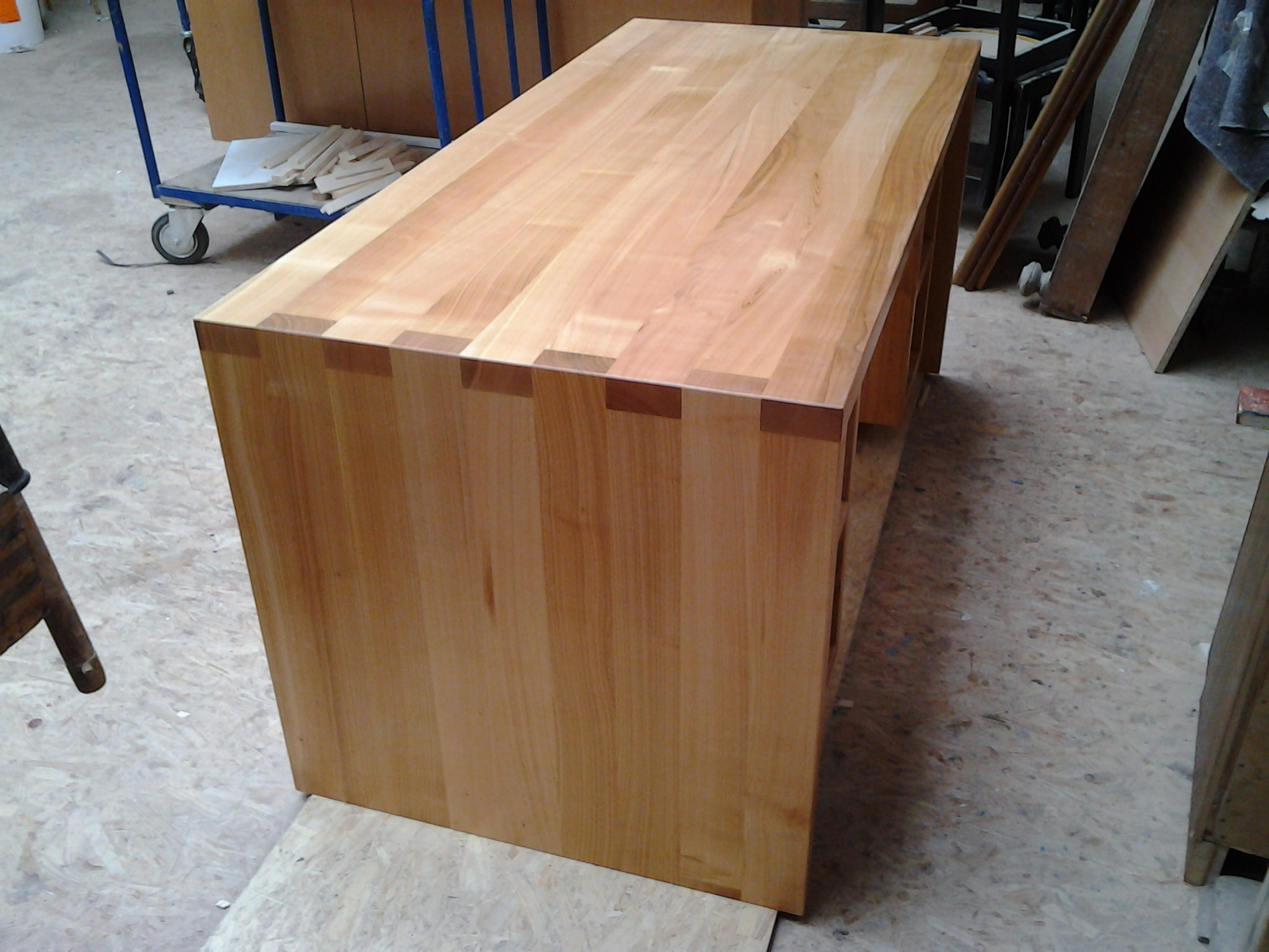Der Schreibtisch wird die Außenmaße 1600 mm Breite sowie 740 mm Tiefe und Höhe haben. Tischplatte und Seiten sind dabei durchgehend aus 40 mm starkem Kirschbaum Massivholz gefertigt und mit Fingerzinken miteinander verbunden. Bei der Fertigung der dazu nötigen Platten werde ich auf Bohlenware zurückgreifen, welche zu regelmäßigen Riegeln aufgetrennt werden, um sie dann als stimmiges Bild zu verleimen.