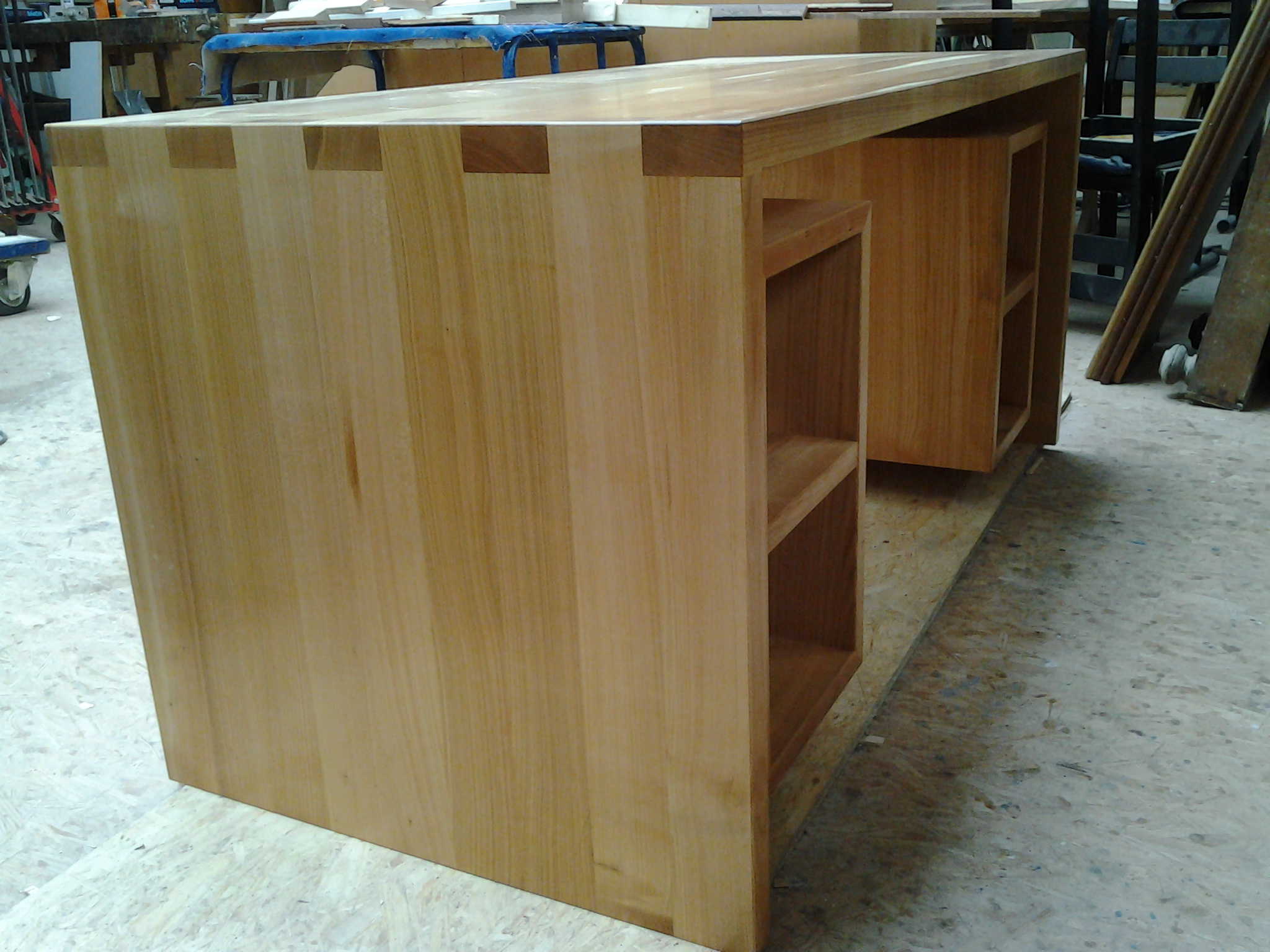 Weiterhin sind beide Korpen in ihrer Tiefe durch eine senkrechte Zwischenwand unterteilt, da eine Tiefennutzfläche von 630 mm nicht sinnvoll wäre. Durch die eingenuteten Zwischenwände lassen sich die Korpen bei einer Platzierung des Schreibtisches im Raum, was ich so vorgesehen habe, von hinten als Buchablage nutzen, sodass kein Raum ungenutzt bleibt.
