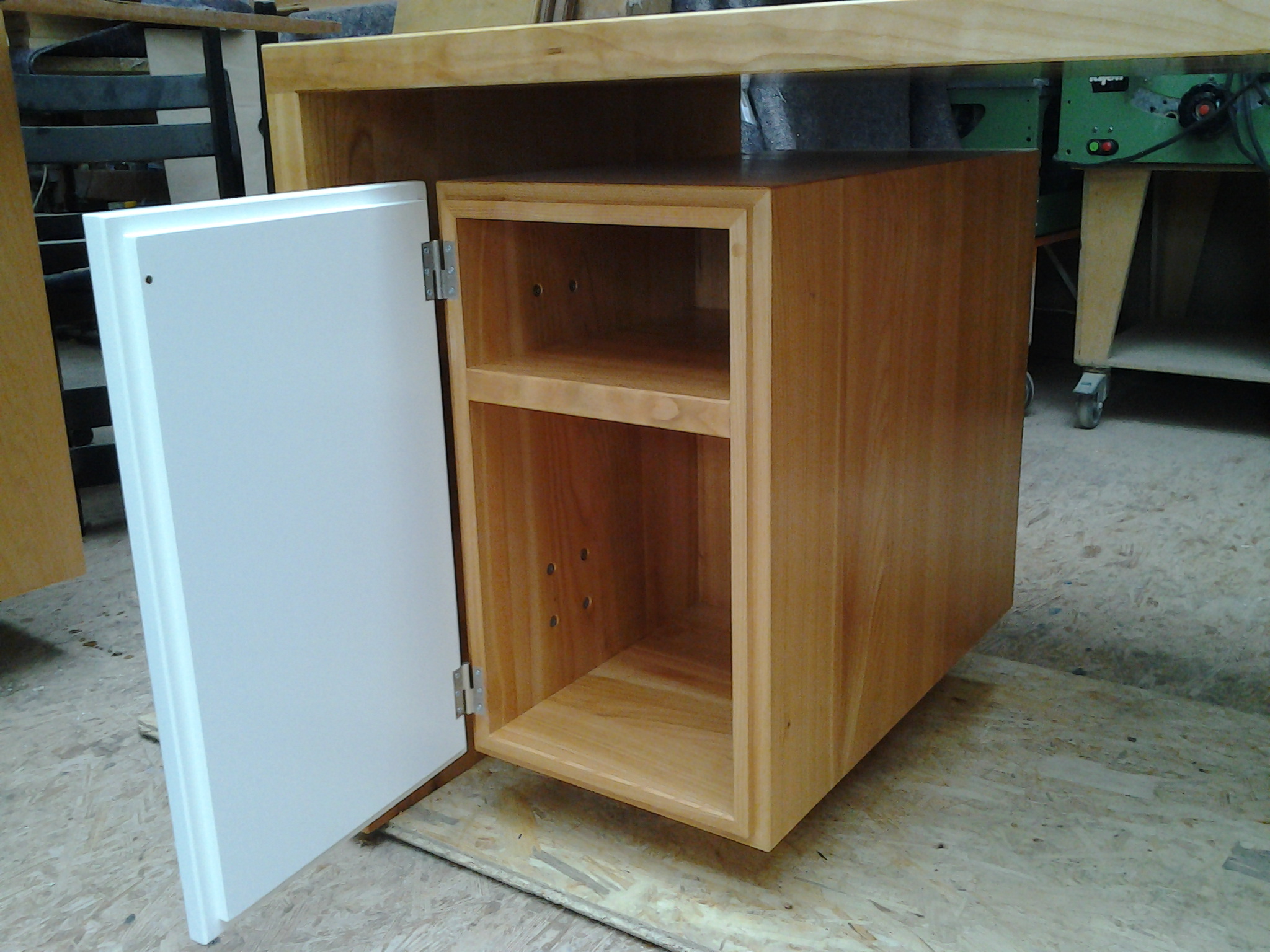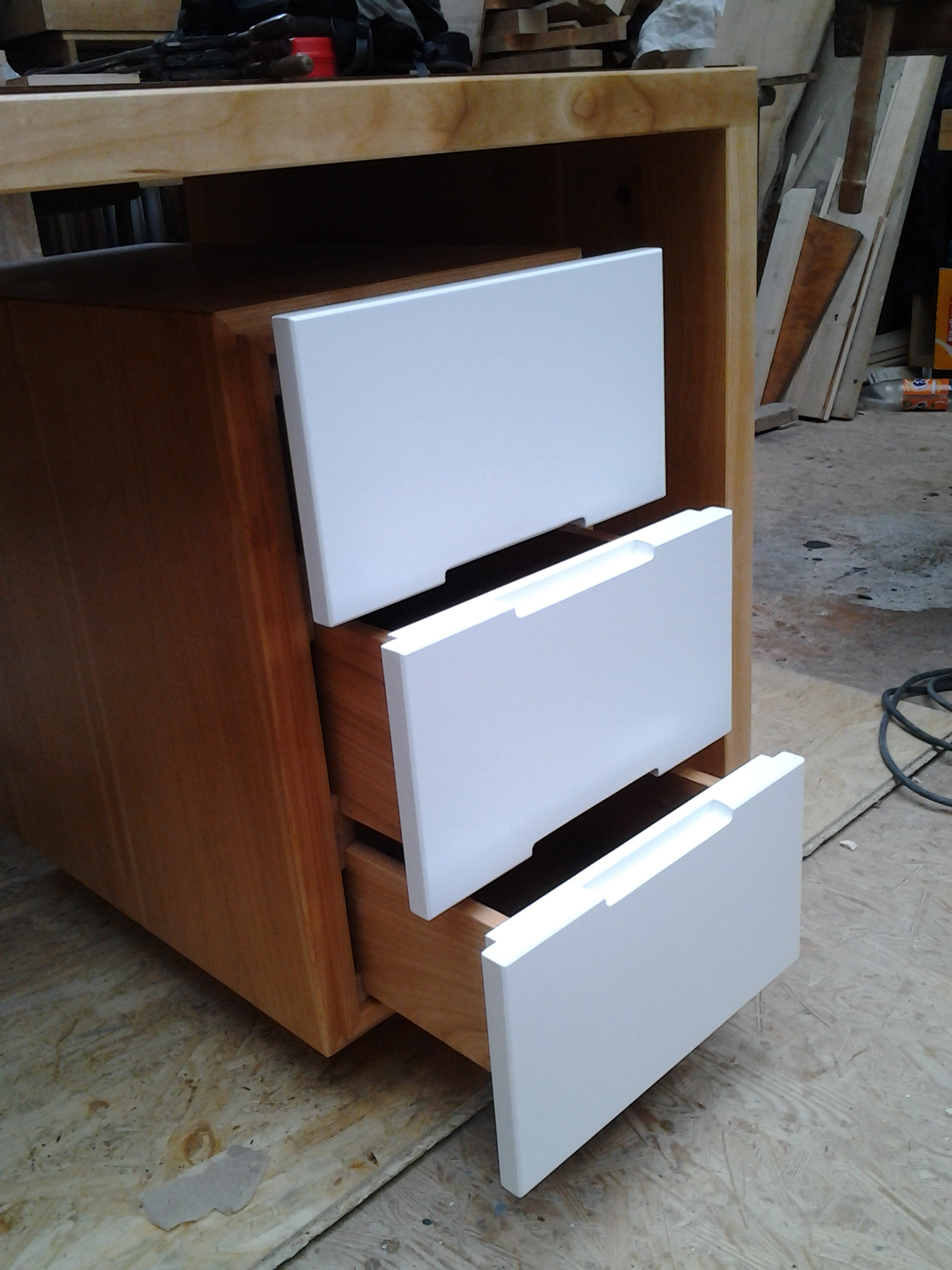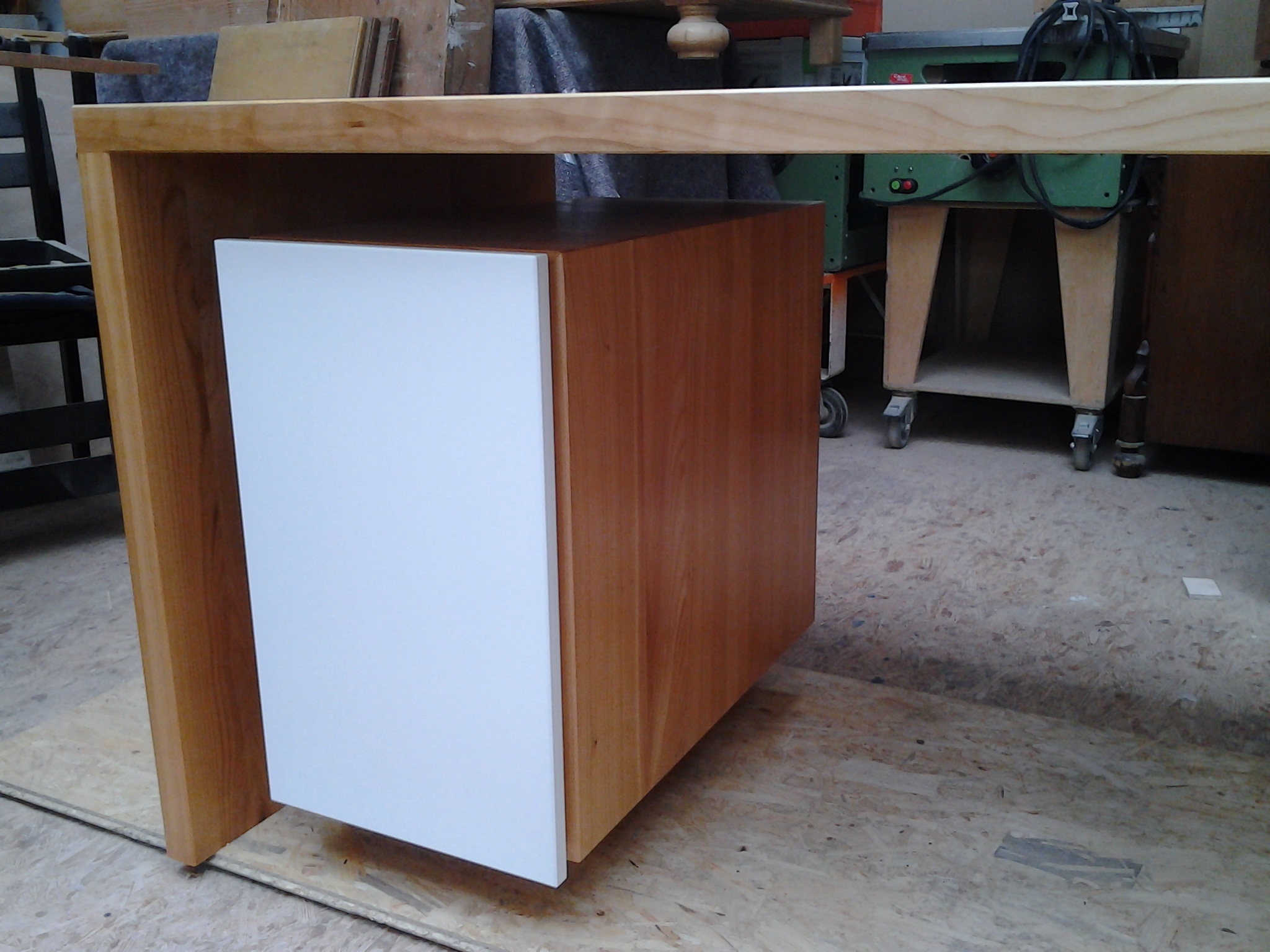 Unter der Schreibtischplatte befinden sich rechts wie links Korpen (330x550x630, b*h*t[mm]) welche nach oben, unten und zur Seite jeweils 75 mm Luft haben und somit den Eindruck vermitteln in der Luft zu schweben. Weiss lackierte MDF-Fronten grenzen dabei die Korpen optisch weiter vom Schreibtischgrundgerüst ab und erschaffen gleichzeitig einen starken Kontrast zum dunklen Kirschbaumholz. Abgesetzt werden die Fronten zu den Korpen durch eine stark betonte Schattennut, die gleichzeitig als Griff genutzt werden soll. Im Bereich der Schubkästen sind zur Unterstützung mittig Griffmulden eingefräst, um ein problemloses Öffnen der Schubfächer zu gewährleisten.