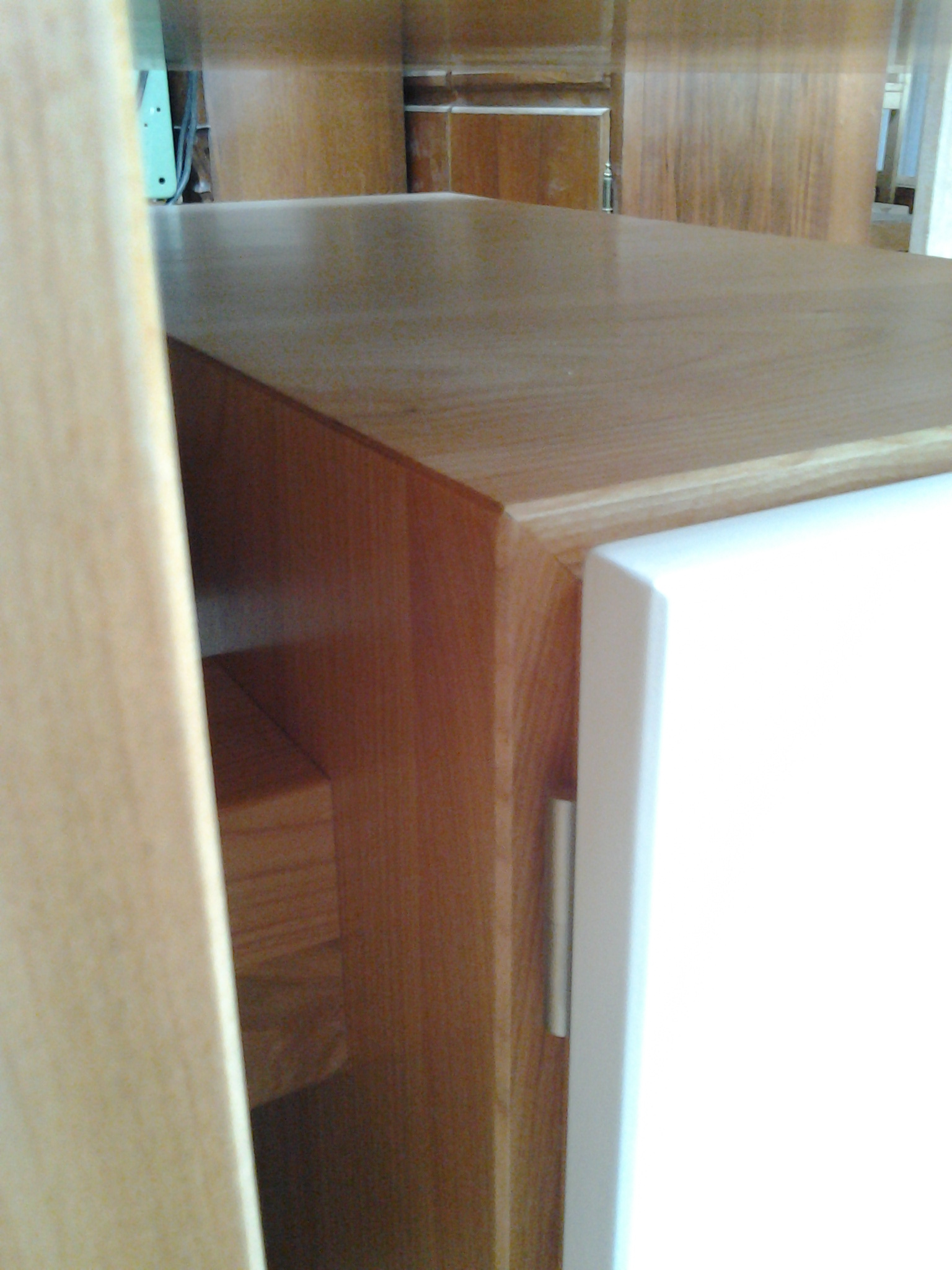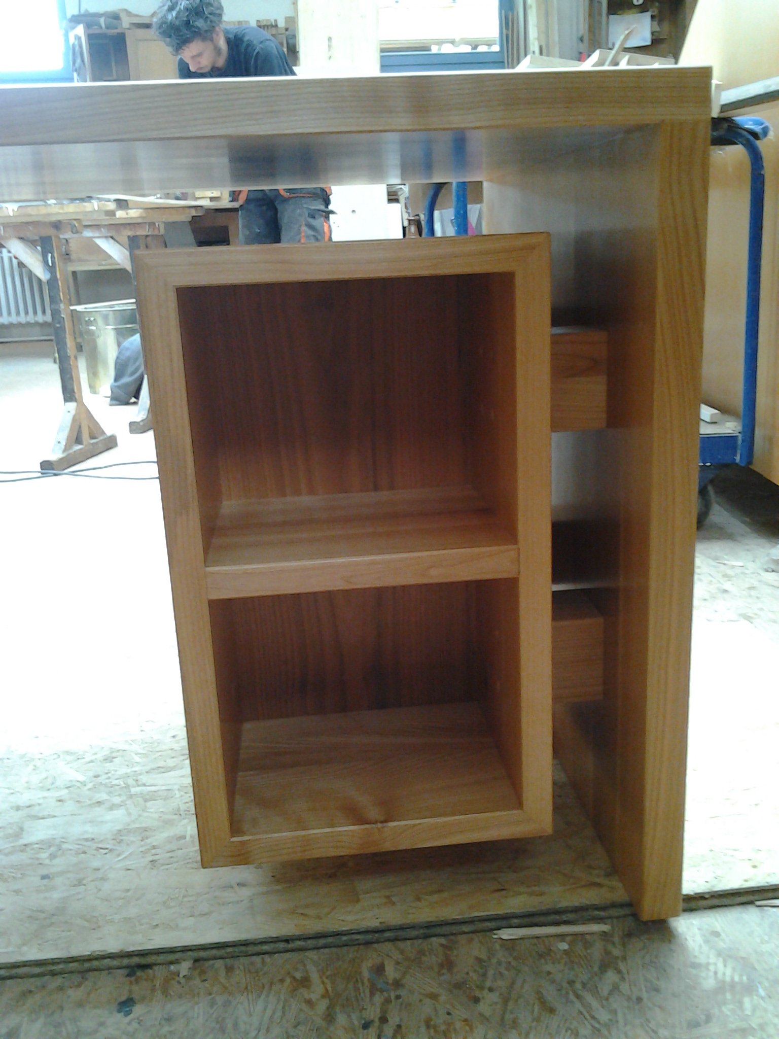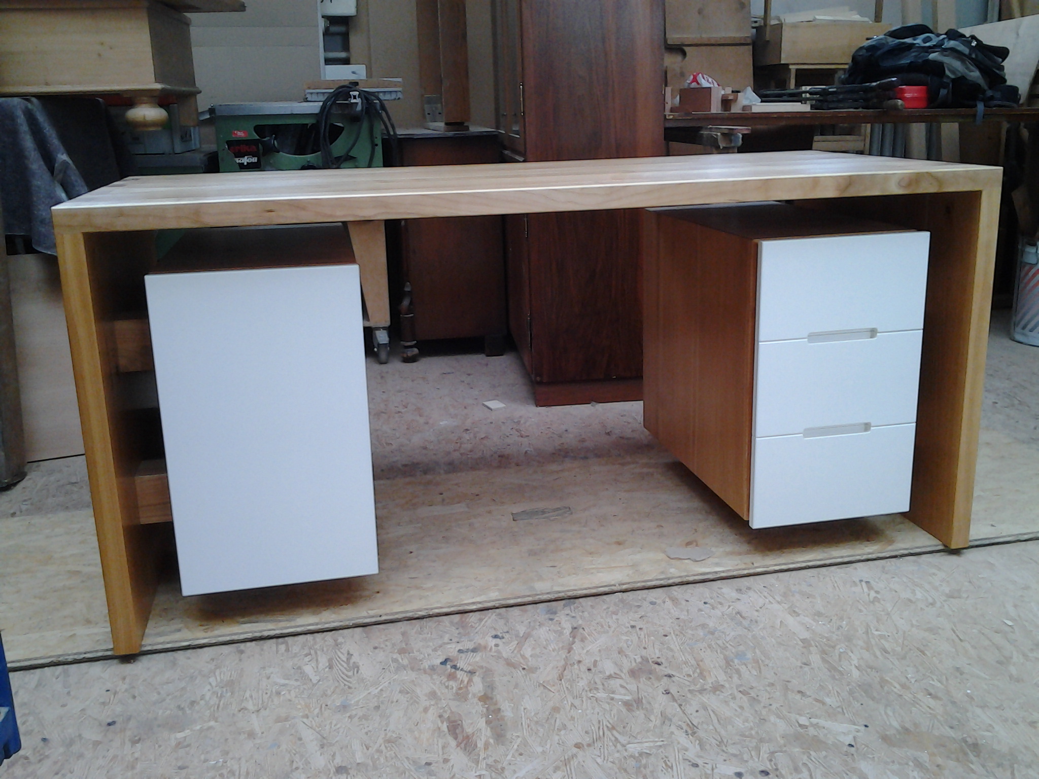 Unter der Schreibtischplatte befinden sich rechts wie links Korpen (330x550x630, b*h*t[mm]) welche nach oben, unten und zur Seite jeweils 75 mm Luft haben und somit den Eindruck vermitteln in der Luft zu schweben. Weiss lackierte MDF-Fronten grenzen dabei die Korpen optisch weiter vom Schreibtischgrundgerüst ab und erschaffen gleichzeitig einen starken Kontrast zum dunklen Kirschbaumholz. Abgesetzt werden die Fronten zu den Korpen durch eine stark betonte Schattennut, die gleichzeitig als Griff genutzt werden soll. Im Bereich der Schubkästen sind zur Unterstützung mittig Griffmulden eingefräst, um ein problemloses Öffnen der Schubfächer zu gewährleisten.